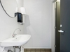 Yderligere faciliteter inkluderer gangareal med garderobeskabe, endnu et toilet med tilhørende forrum og vask, mødelokale med epoxygulv og adgang via vindfang samt en lys kantine med køkkenskabe og bordarrangement.