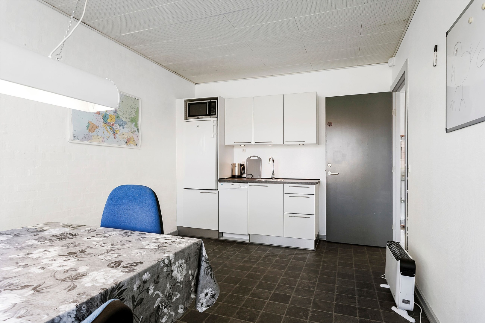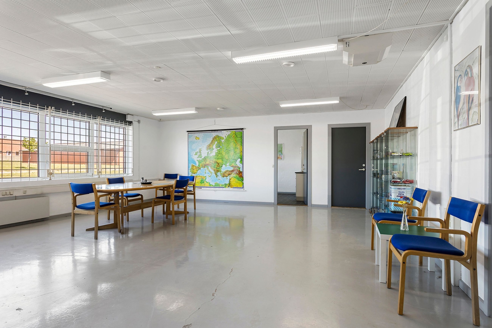 Yderligere faciliteter inkluderer gangareal med garderobeskabe, endnu et toilet med tilhørende forrum og vask, mødelokale med epoxygulv og adgang via vindfang samt en lys kantine med køkkenskabe og bordarrangement.