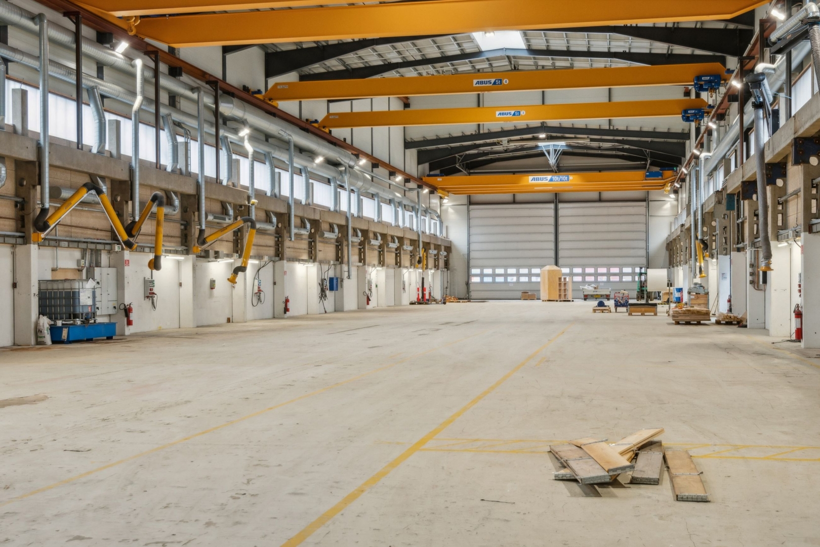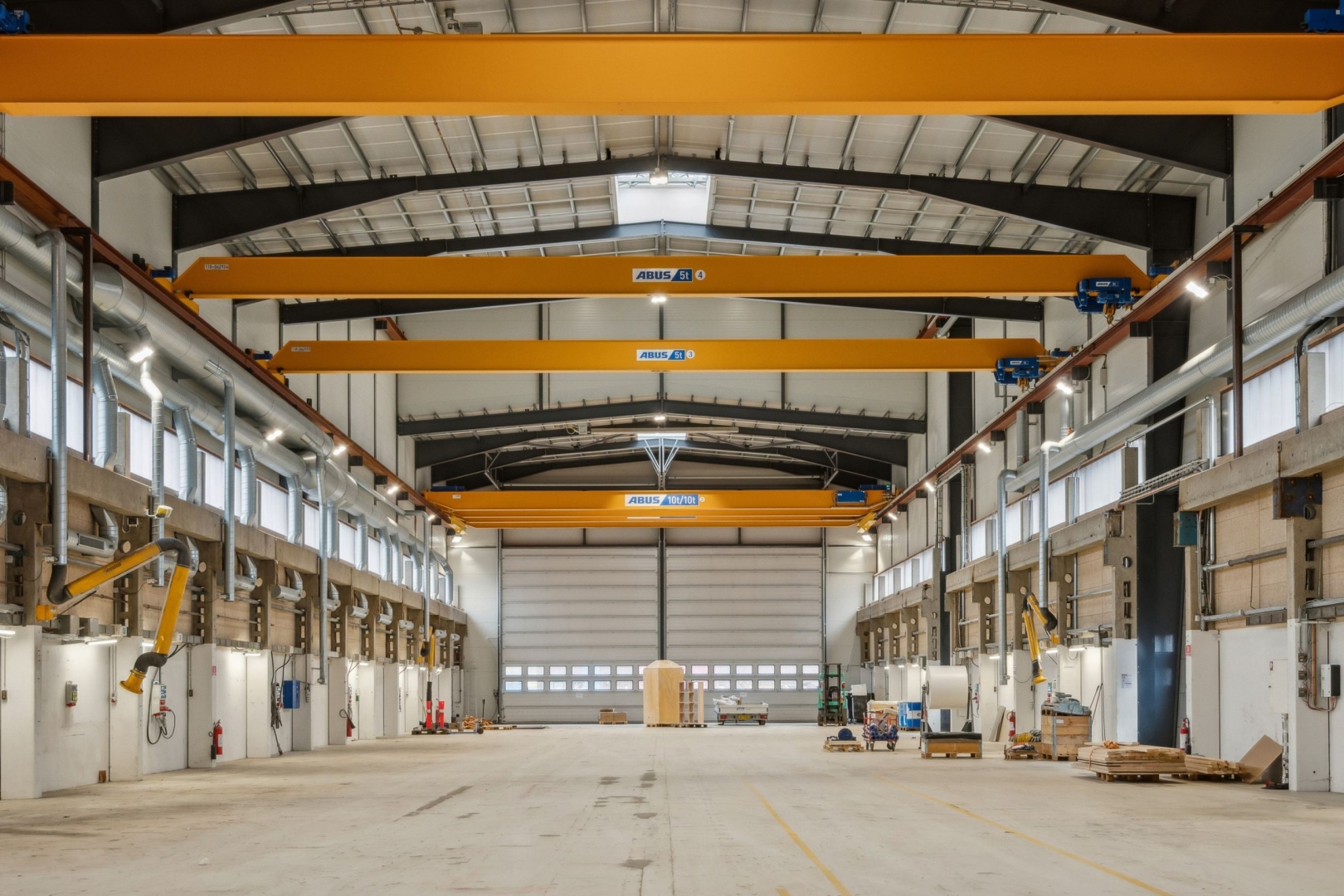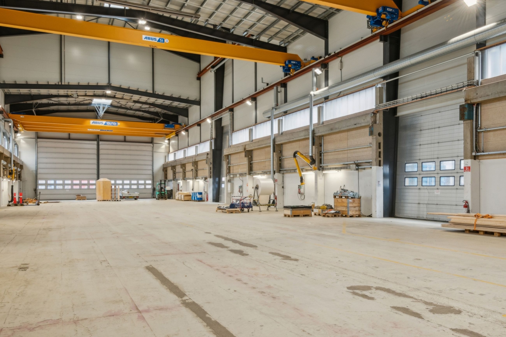 Produktionshallen er indrettet med moderne faciliteter, der understøtter tunge og krævende produktioner. Den rummer 8 traverskraner med kapacitet fra 5 til 16 ton, samt 4 aluporte, der sikrer nem adgang til og fra bygningen: