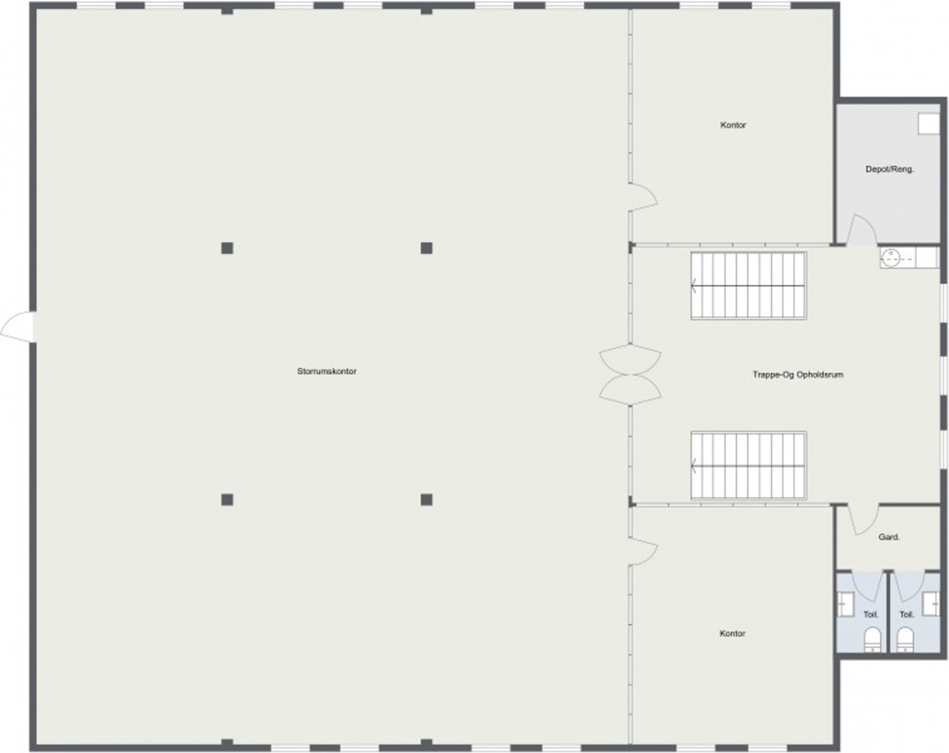 På 1. sal i en af de ældste bygninger på Frederikshavn gamle vært er der nu indrettet 500 m2 storrumskontor/konference fordelt på følgende - godt velkomst areal med anretterkøkken - 2 kontorer på hver 37 m2 - storrumskontor/konferencerum med merbaugulvbelægning. - forrum til 2 toiletter - depot/rengøringsrum.