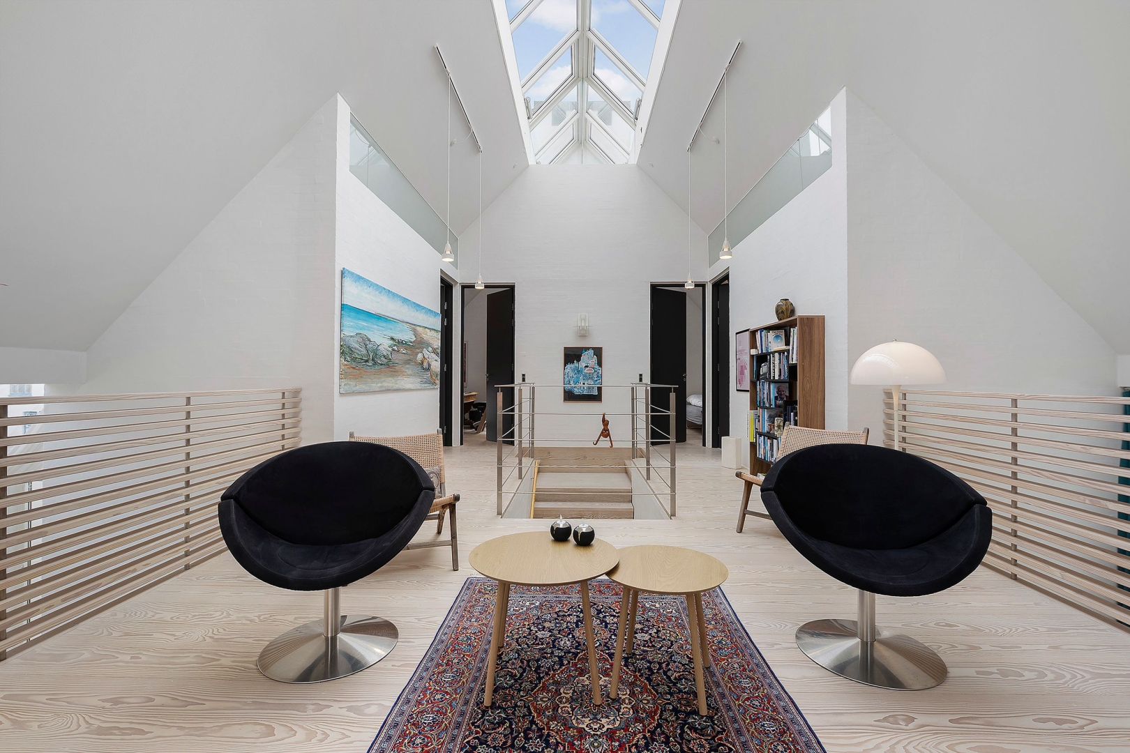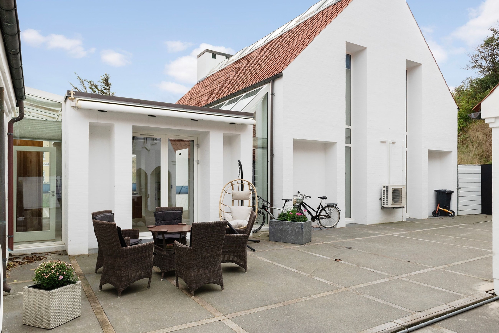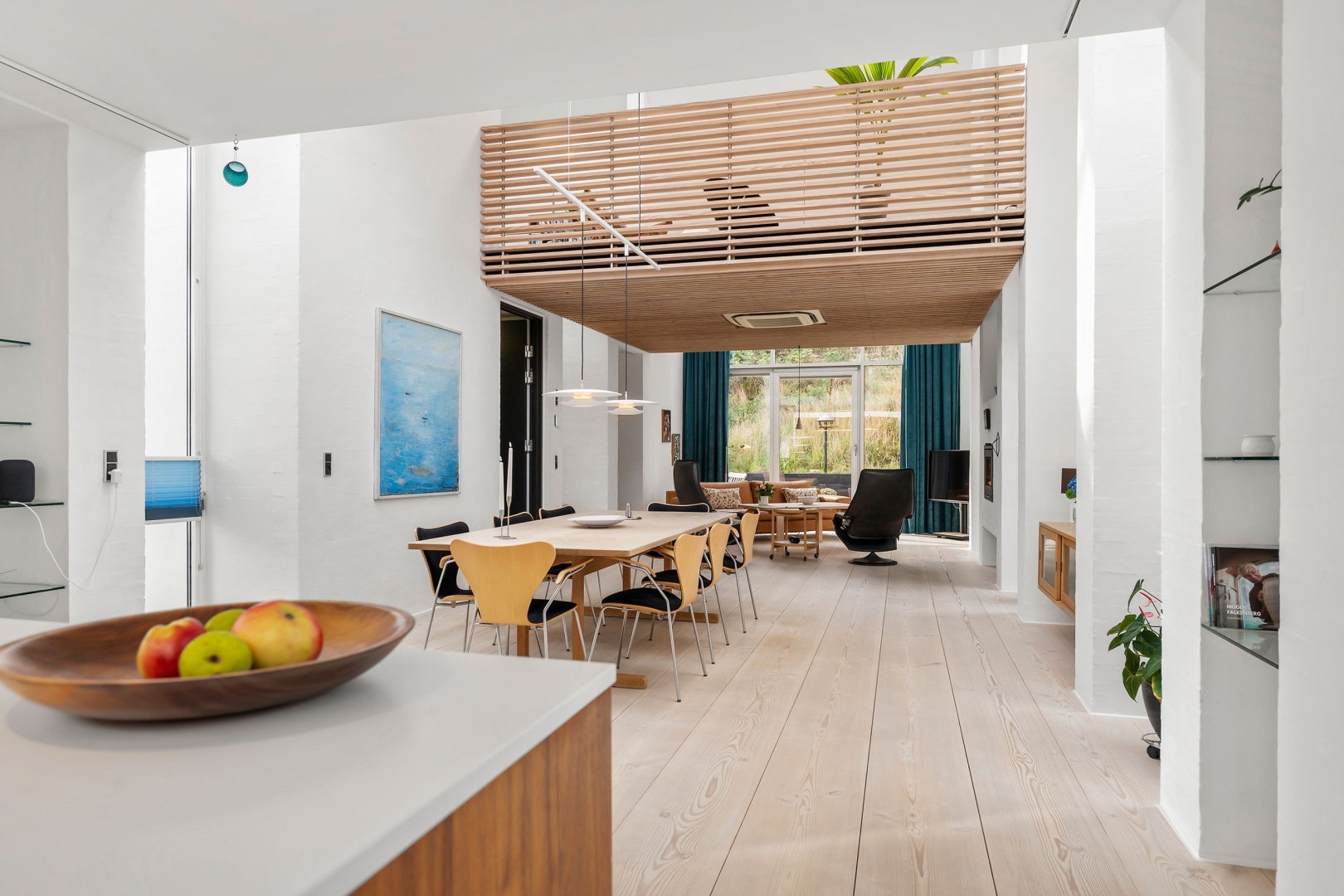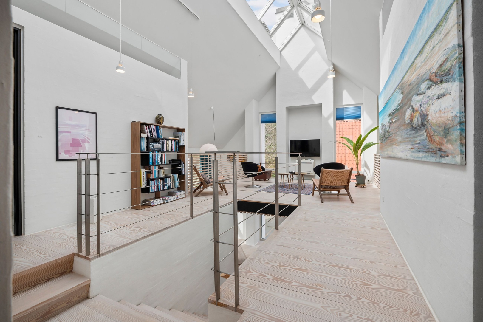 Denne markante og synlige liebhaverejendom ligger centralt placeret midt i Lønstrups charmerende bymidte. Her forenes historisk sjæl og moderne komfort i en ejendom, der på én og samme tid tilbyder rummelig bolig og attraktive erhvervsmuligheder.Den oprindelige bygning er opført i 1905, mens en eksklusiv tilbygning fra 2005, tegnet af arkitekt Jørn Schütze, tilfører ejendommen ekstra boligareal i et smagfuldt design, hvor materialevalget er nøje afstemt med bl.a. fantastiske Dinesen gulve i alle opholdsrum i den nye afdeling. De hvide facader, det røde tegltag, kobbertagrenderne og den smukke kobberinddækkede kvist mod Strandvejen skaber en harmonisk helhed og et indtryk af kvalitet.Ejendommen rummer i alt 347 m² bolig og 73 m² erhverv, hvortil der hører en dobbeltmuret garage med to aluporte, elektrisk port i indkørsel og et godt aktivitetsrum eller gildesal ovenpå. Havearbejdet skal I ikke bekymre jer om, idet udenomsarealerne er anlagt med støbte betonfelter smukt adskilt af jerntræ, hvilket giver et stilrent og vedligeholdelsesvenligt udtryk.Planløsningen er opdelt i to bygningsafsnit, der er smukt forbundet. I vest- og mellembygningen finder man et eksklusivt håndbygget Søgaard køkken i massiv valnød med luksus hvidevarer fra Gaggenau og en elegant svævende køkkenø. Køkkenalrum er åbent mod opholdsstuen, som er udstyret med pejseindsats og store vestvendte vinduespartier, der giver et skønt lysindfald og adgang til den lukkede, ugenerede gårdhave. Gulvvarme, massive Dinesen plankegulve med en imponerende længde på op til 15 meter samt en indbygget varmepumpe, der kan opvarme og køle hvilket giver rummet en særlig eksklusiv atmosfære. I stueplan findes desuden badeværelse med bruseniche, et soveværelse med skydedørsgarderobe samt 2 yderligere værelser, et med direkte adgang til opholdsstuen og et med udgang til den sydlige indkørsel. Værelset kan måske anvendes til atelier eller andetFra stuen fører en trappe op til første sal, hvor en imponerende opholdsstue med loft til kip, rytterlys og varmepumpe udgør hjertet. Her er også to gavlværelser med adgang til hems hvor I finder en himmelseng med stjernekig, indbyggede skabe, loft til kip og udgang til altan, kontor/mindre værelse samt et badeværelse med bruseniche.Østbygningen byder i stueplan på et køkken med hvide fronter og køkkenø, et bryggers med klinkegulv og el-gulvvarme samt plads til vaskefaciliteter, kontor med 3- 4 kontor arbejdspladser og luft-til-luft varmepumpe, yderligere et godt kontor, en rummelig entre og et kundetoilet. På første sal finder man et stort badeværelse med spa, dobbelt håndvask, marmorklinker og direkte adgang til sauna, et værelse samt et repos med synlige bjælker, loft til kip og tagvindue. Endelig rummer et stort værelse eller opholdsrum skydedørsskabe, loft til kip og udgang til terrasse.Ejendommen er ikke blot et hjem, men også en investering. Den østvendte bygning har i en årrække været udlejet til ejendomsmæglerfirmaet Hedegaard Madsen og indbringer en årlig lejeindtægt på kr. 220.000 + moms og forbrug.