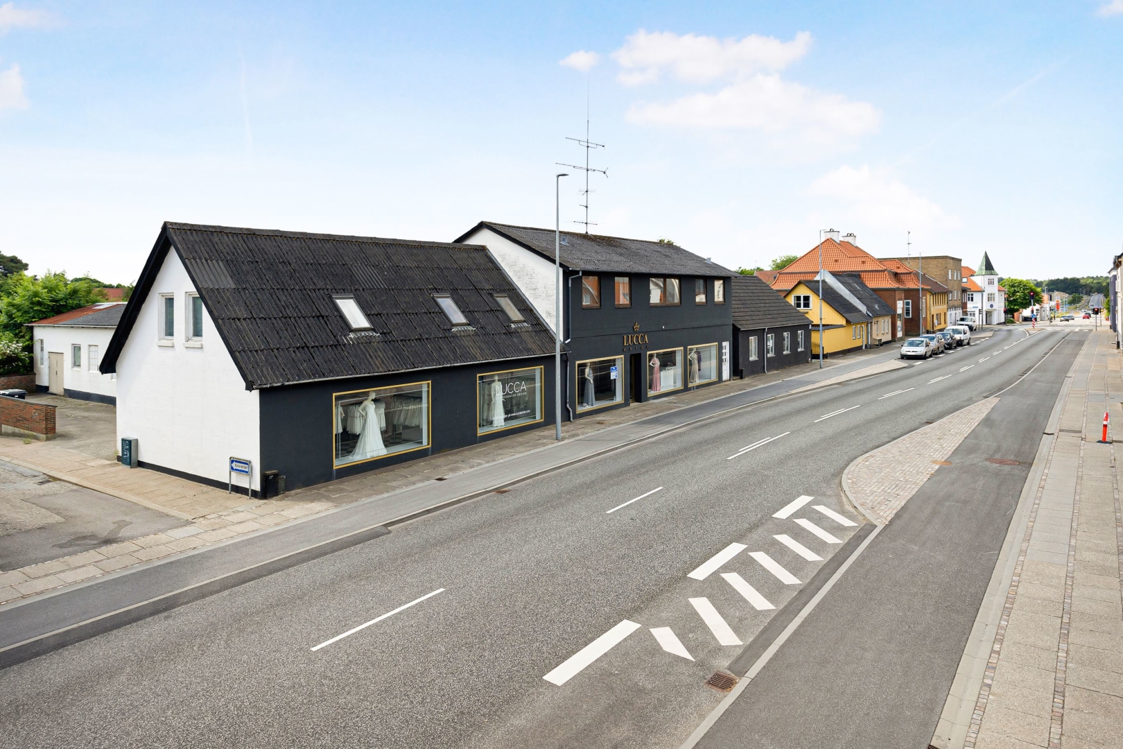 Velbeliggende og velholdt blandet bolig og erhvervsejendom bestående af 228 m2 butik og 188 m2 bolig på 1. sal samt 80 m2 fritliggende lager.
