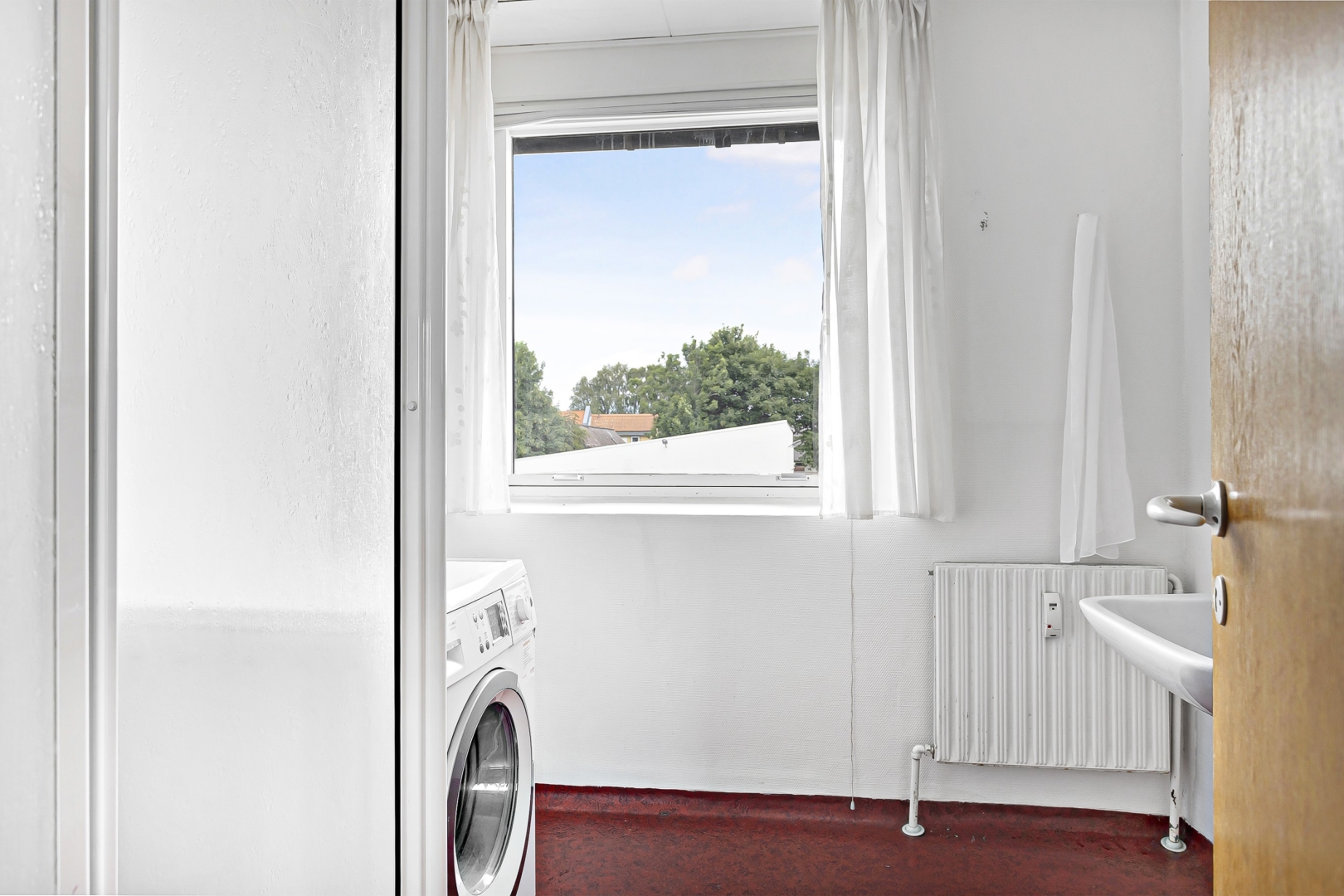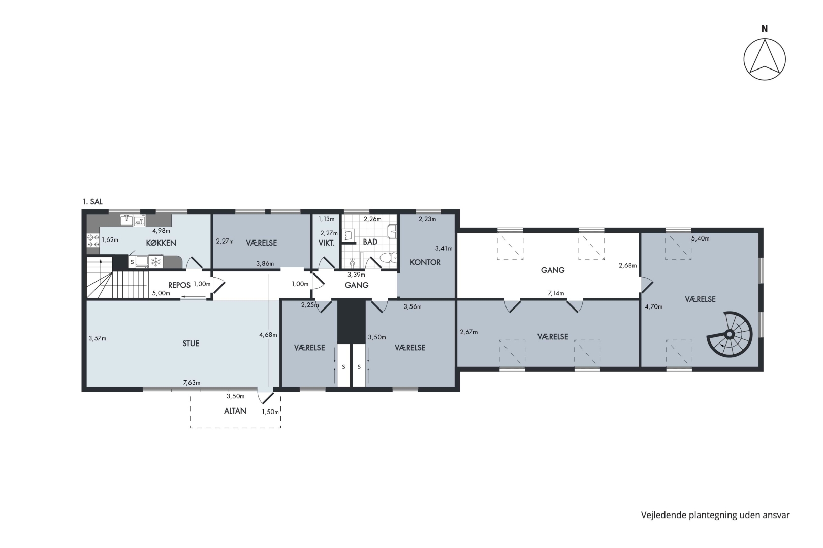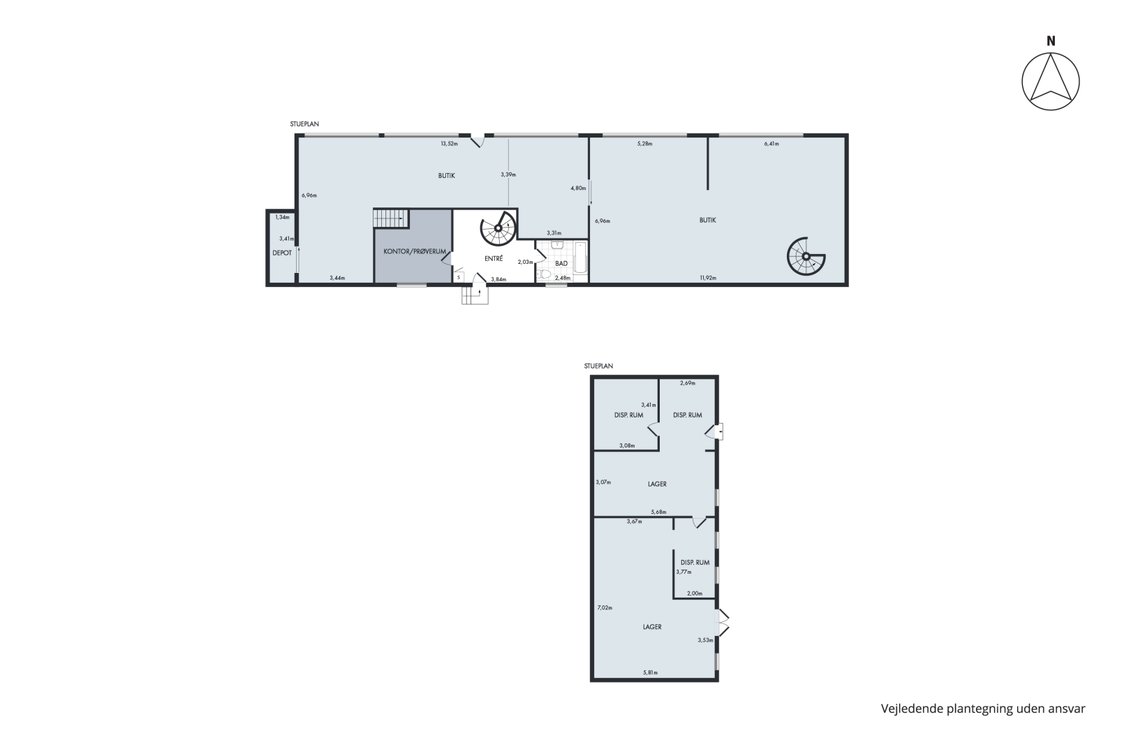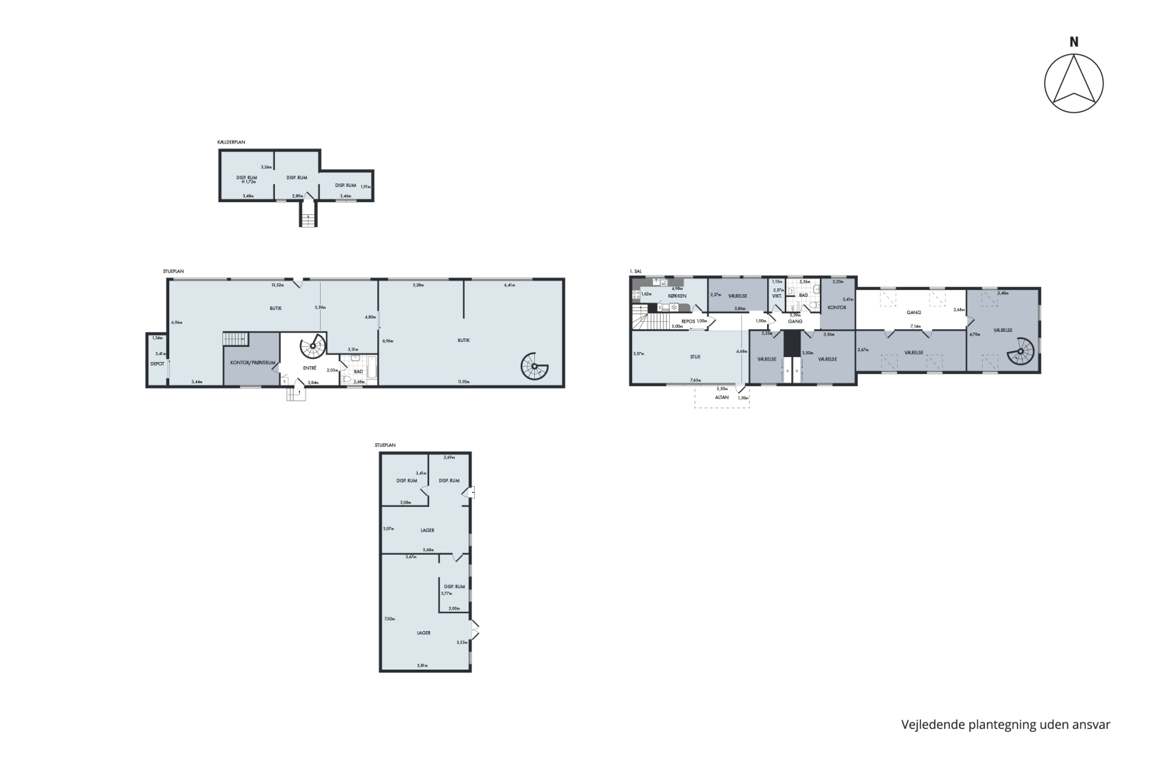 Der er fra butiks lokalet indgang til mindre lagerrum og 2 trapper til 1. sal der indeholder og anvendes som lager og kontor og kantine samt velfærdsrum og toilet/badeværelse. 1. salen har tidligere været anvendt som bolig og er registreret som bolig på BBR ejermeddelelsen.