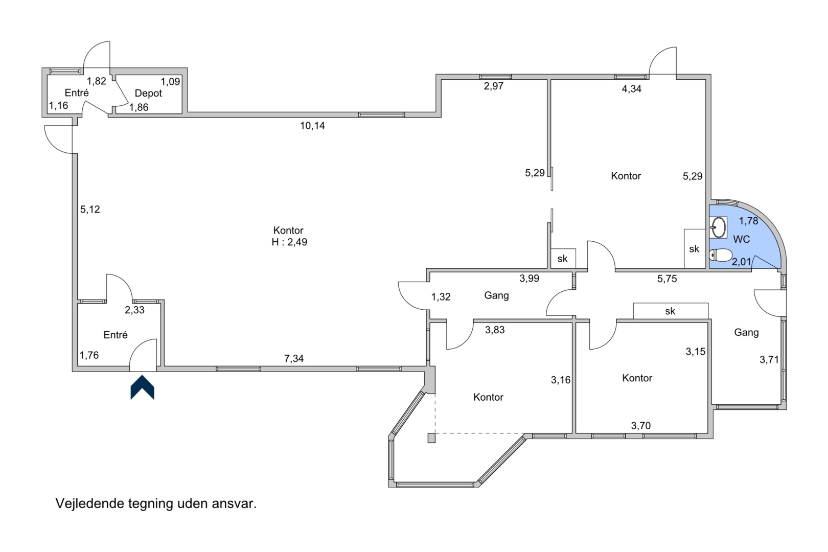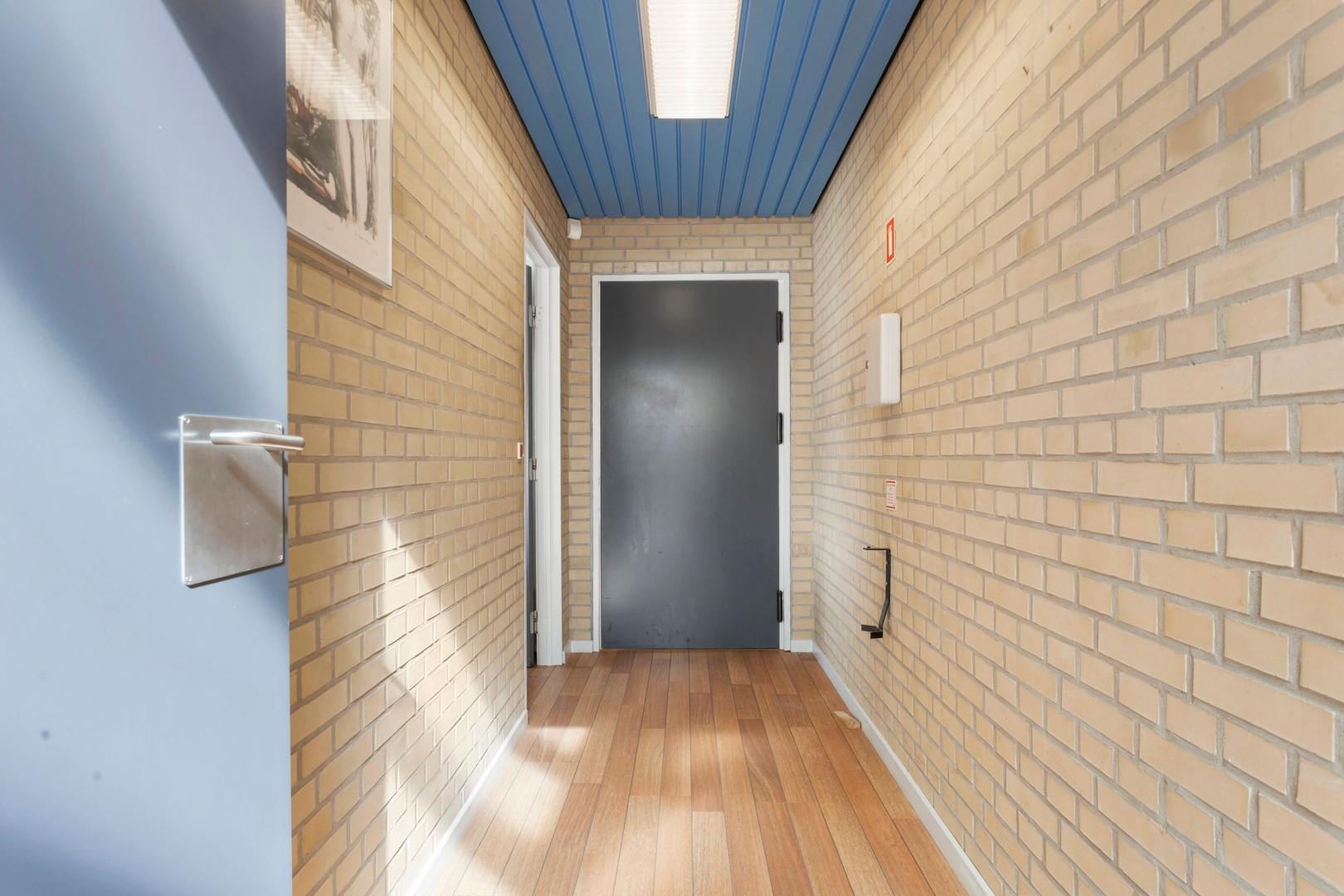 En praktisk fordelergang, der forbinder lokalerne med adgang til teknikrum/arkiv, toilet og et separat kontor.