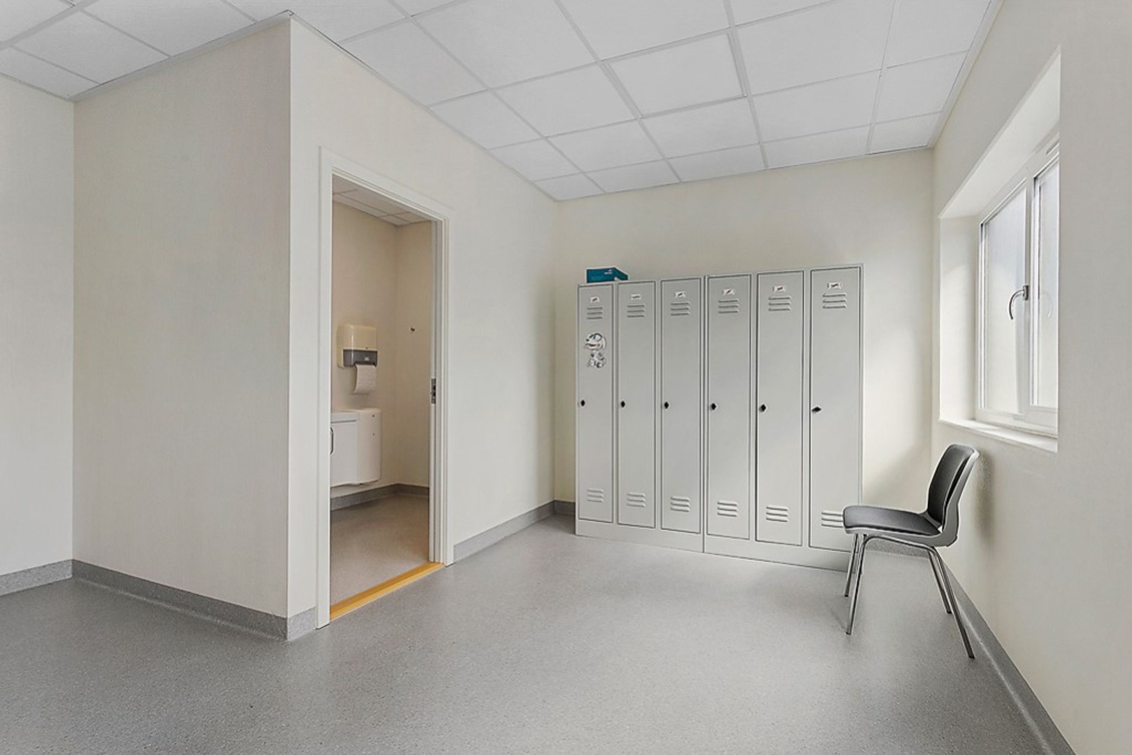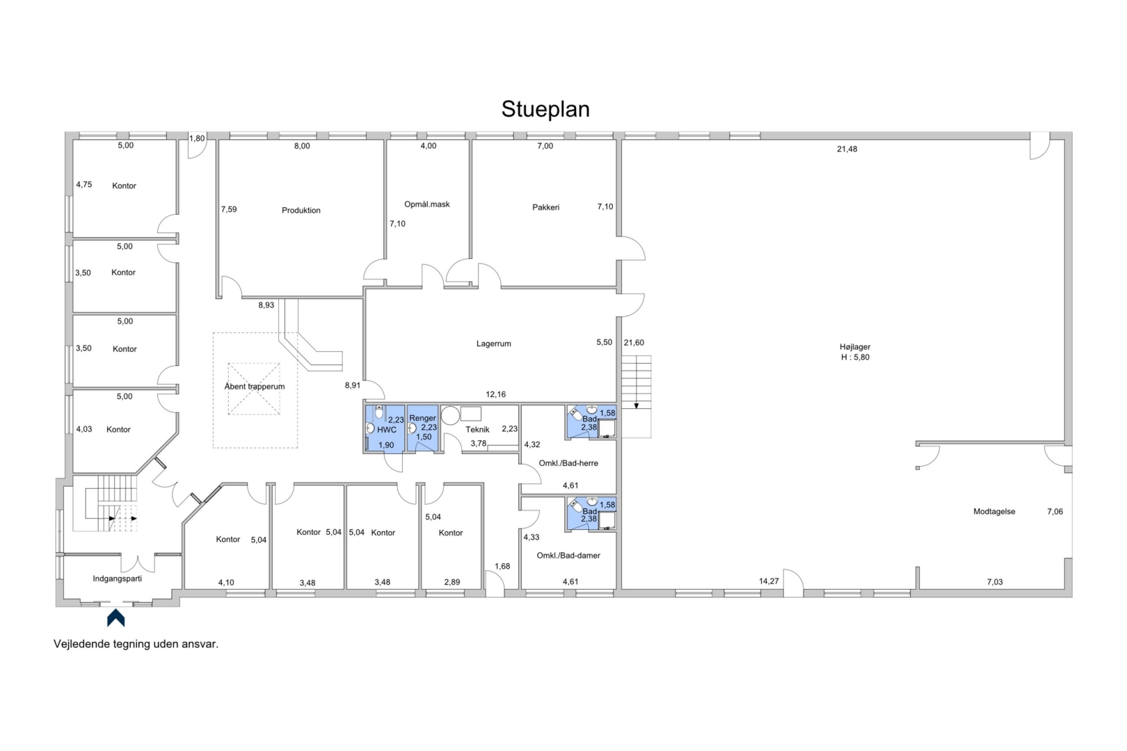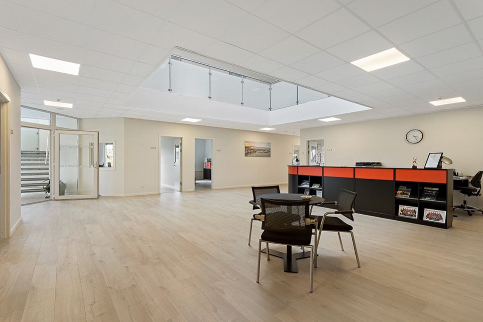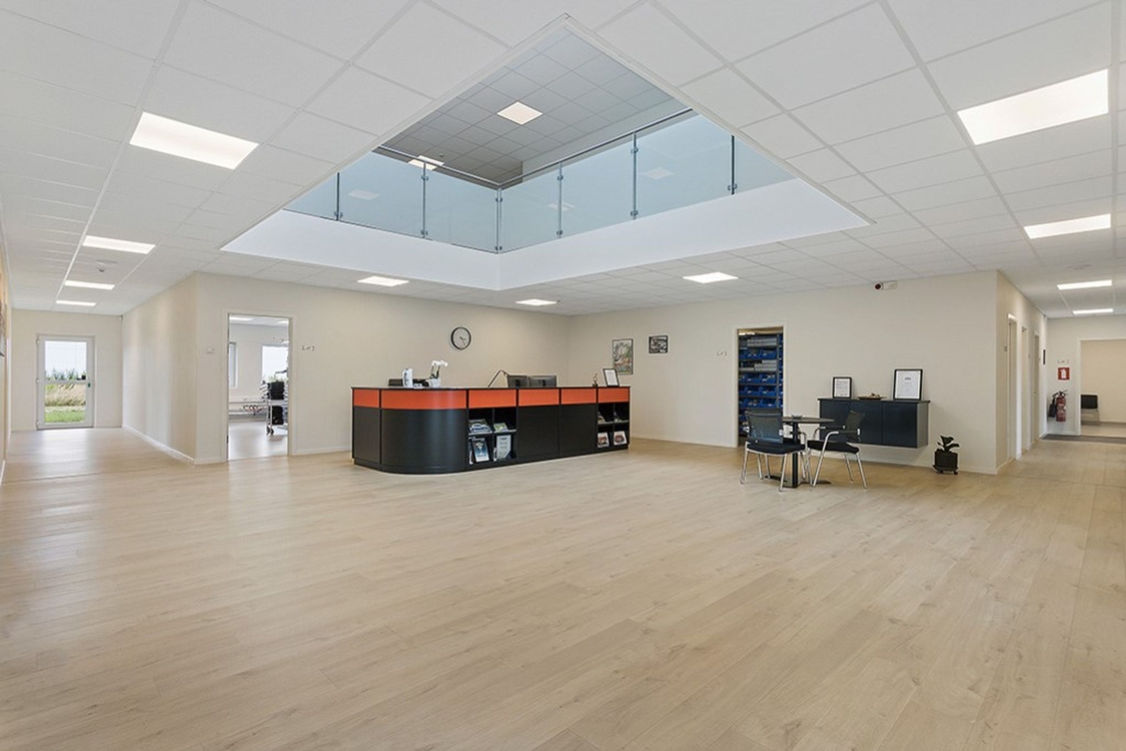 Ejendommen byder på en imponerende og funktionel indretning med en stor, åben reception, velindrettede kontorer, montageafdeling, klargøringsområde, omklædningsfacilliteter, teknikrum, badefaciliteter samt et rummeligt lager med 6 meters frihøjde og effektiv vare ind- og udlevering.