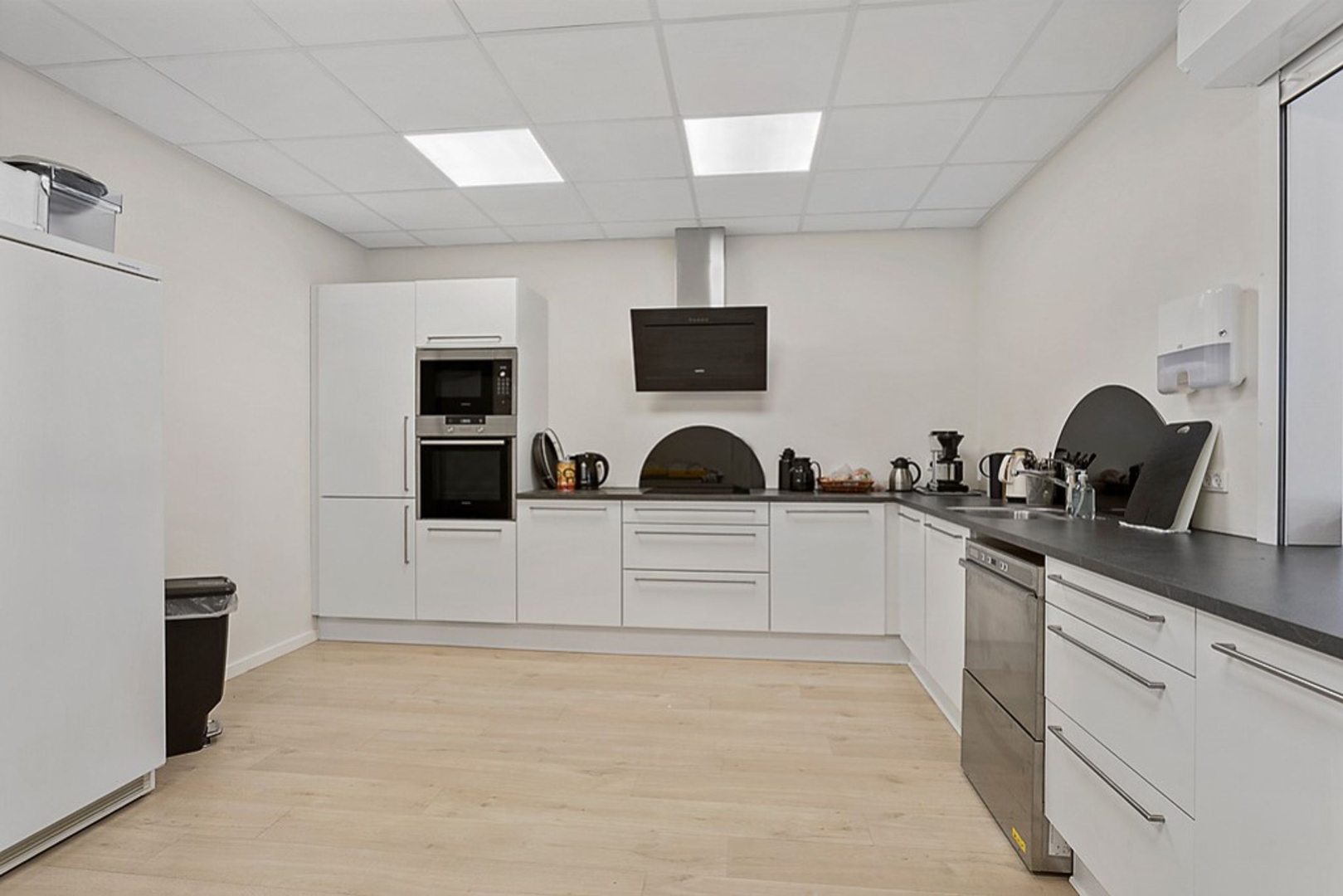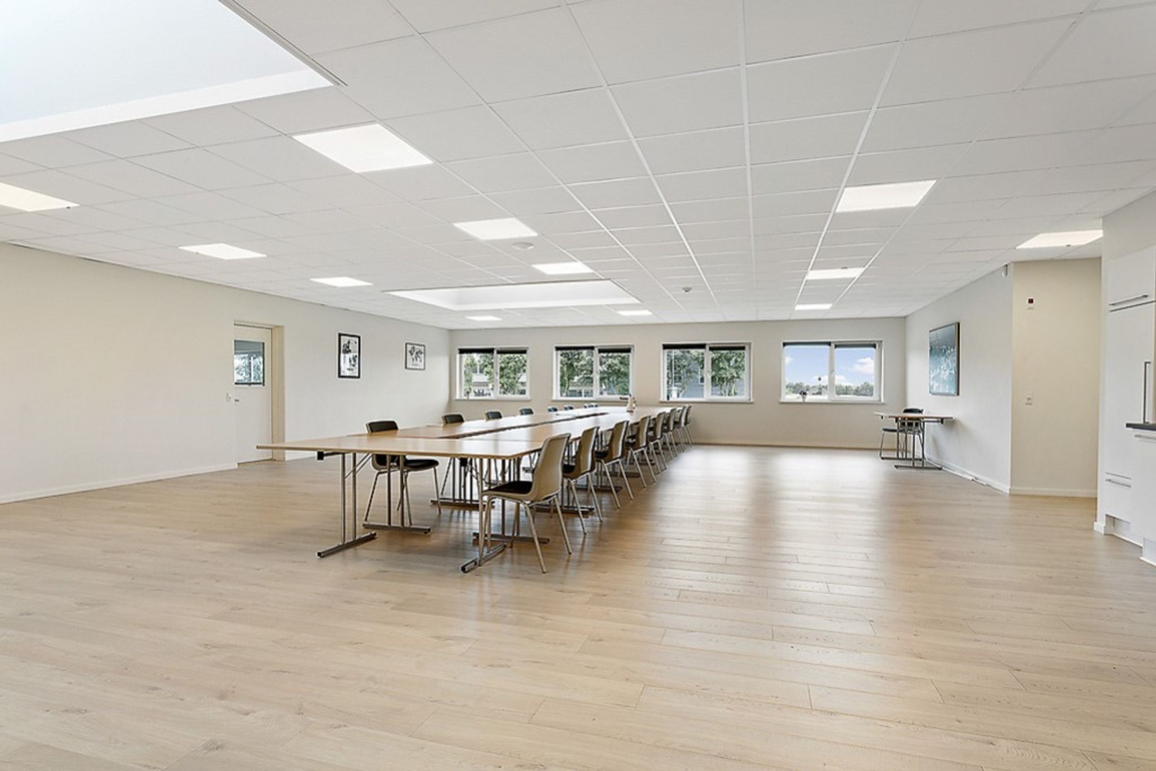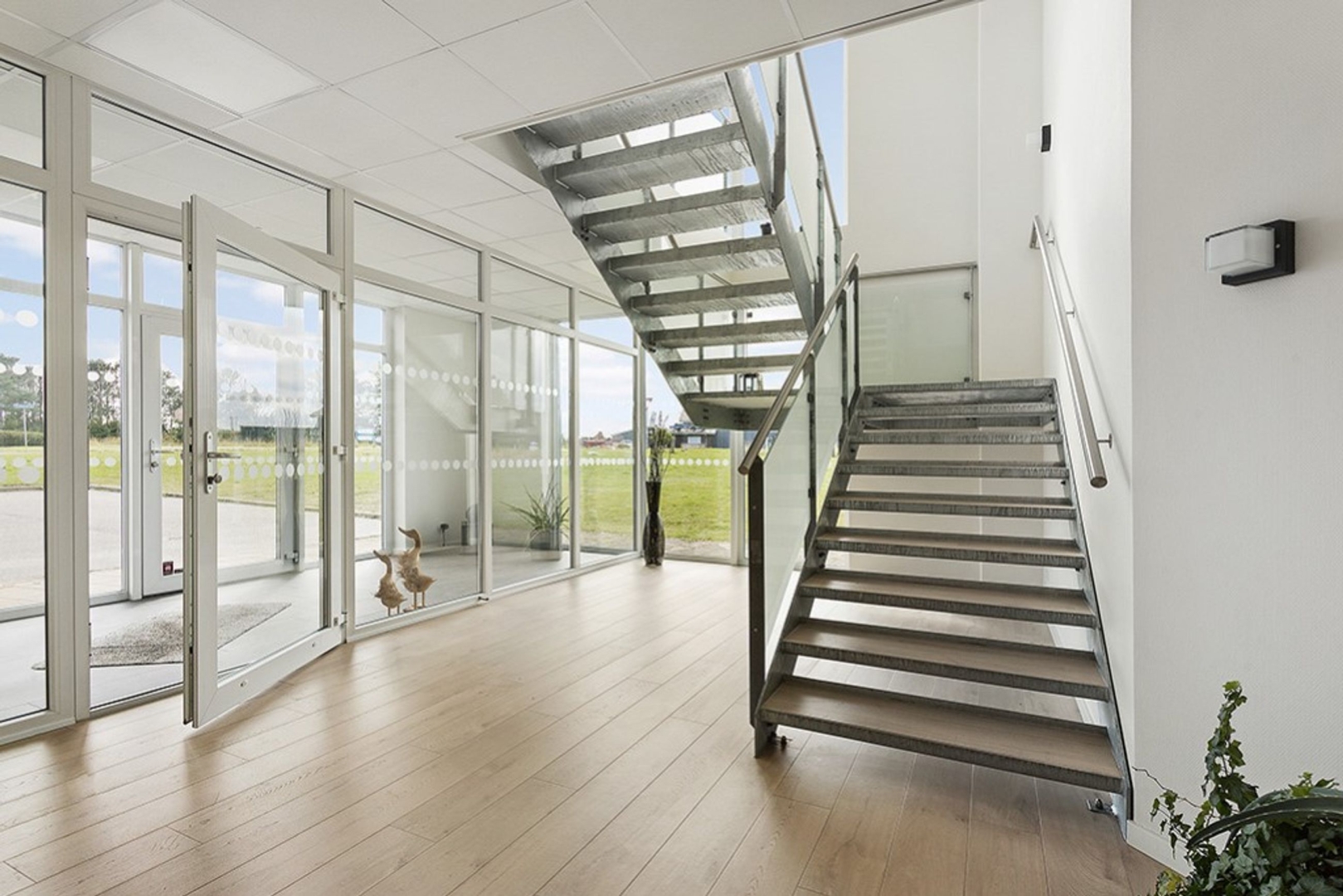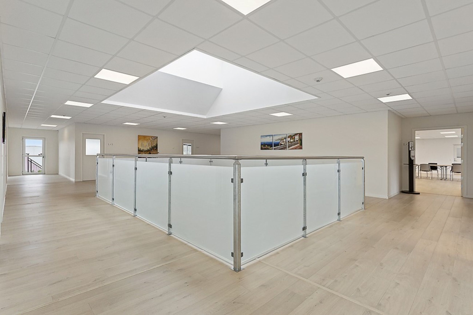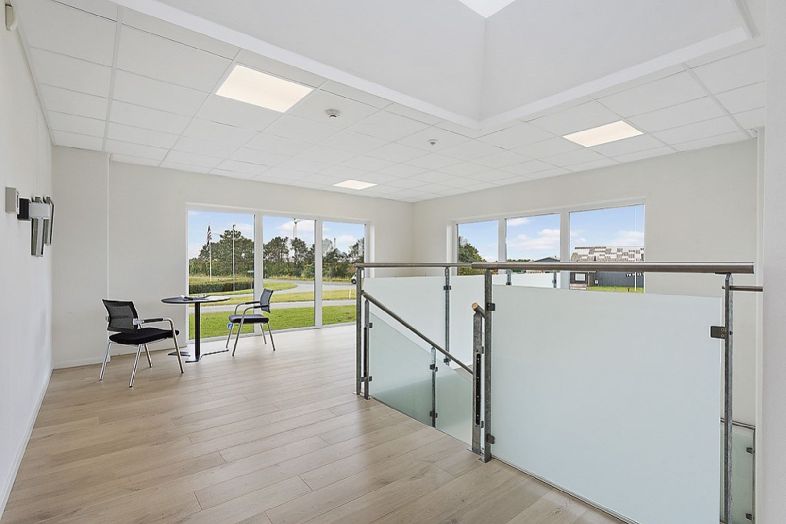 Overetagen rummer yderligere kontorer, et stort mødelokale, og en kantine med tilhørende køkken. Den elegante balkon med udsigt til stueetagen og det unikke lysindfald fra specialdesignede vinduer bidrager til et inspirerende arbejdsmiljø.