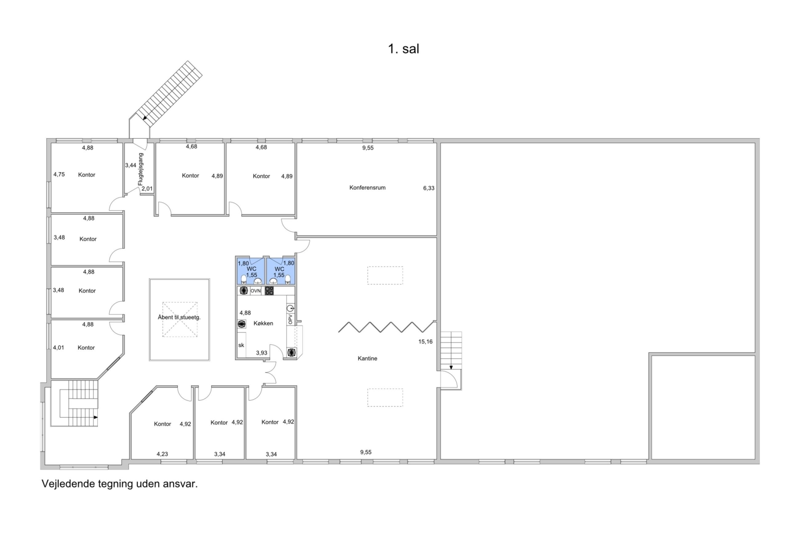 Opført i robuste materialer som sandwichbetonelementer med frilagte overflader og termoruder i plastrammer, tilbyder ejendommen en kombination af kvalitet og holdbarhed. Med en fuld stueetage på 1.092 m2 og en overetage på ca. 582 m², er ejendommen ideelt indrettet til at imødekomme en bred vifte af erhvervsaktiviteter.