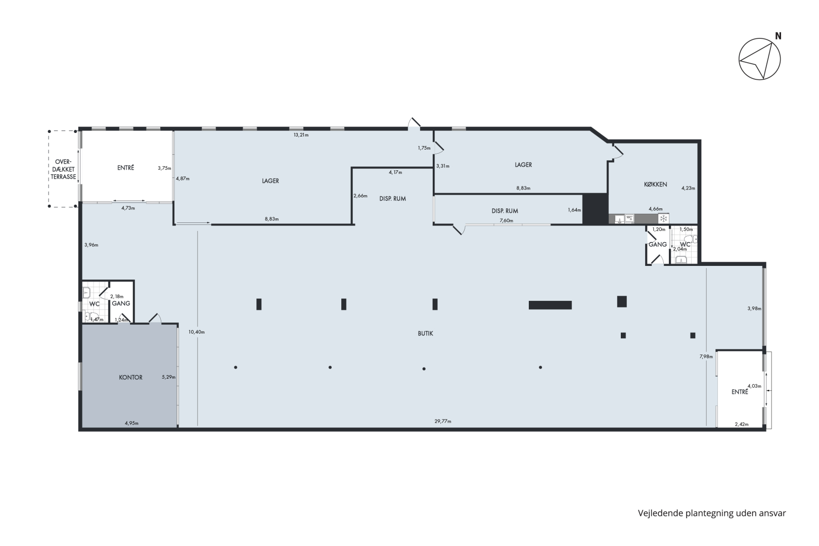 Lejemålet fremstår i meget fin stand og indeholder regulært butikslokale, lager og kontor og toilet og køkken.