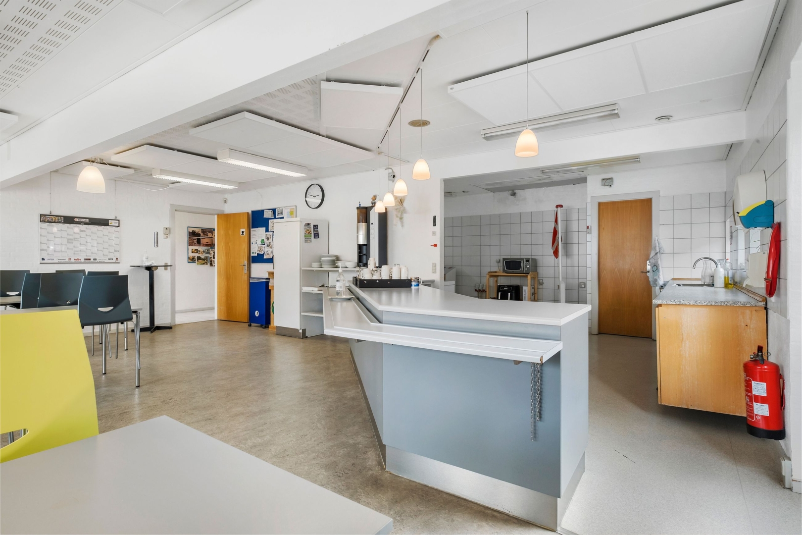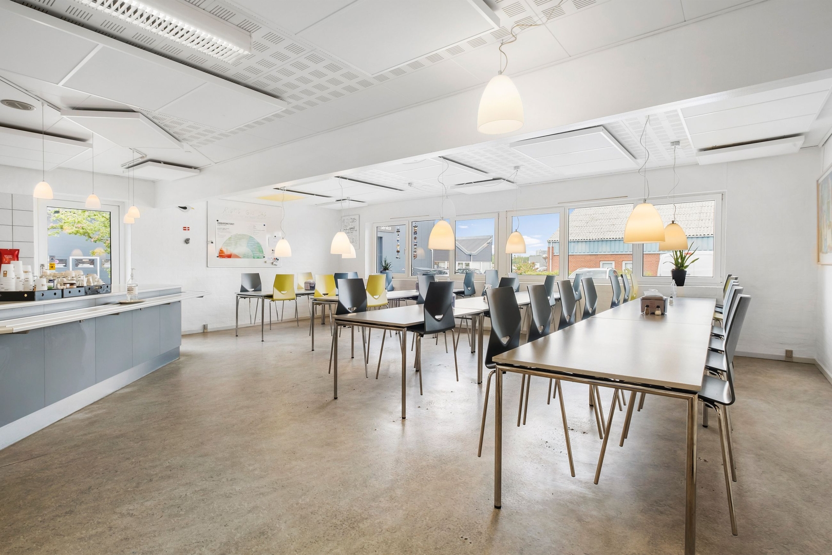 Stor kantine med plads til ca. 50 personer, inkl. køkken og serveringsdisk