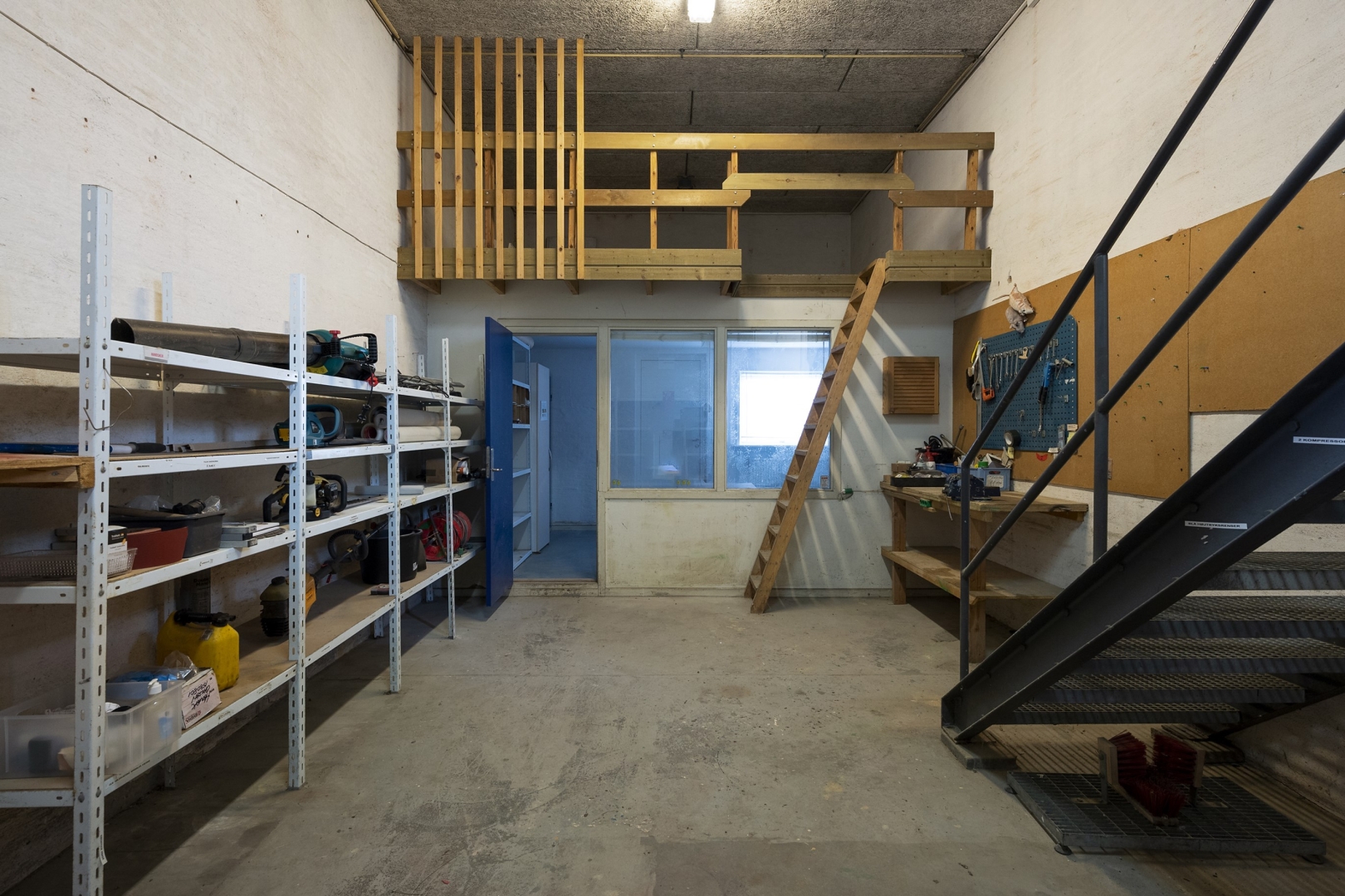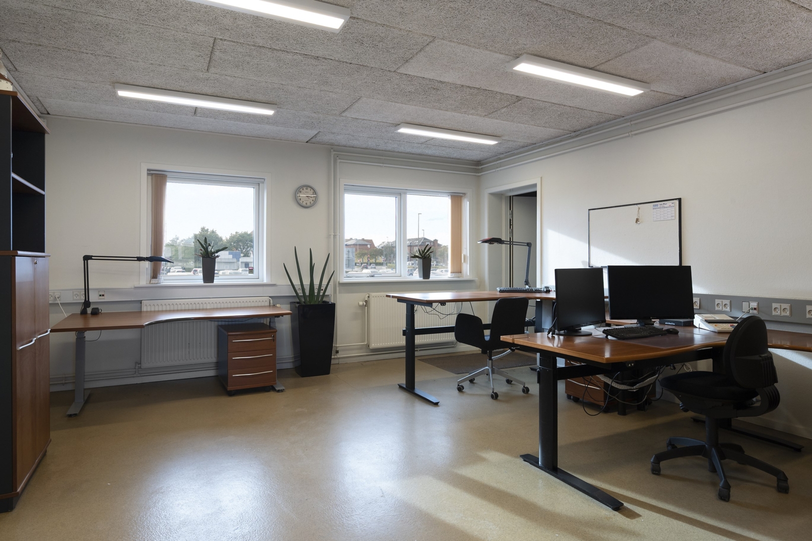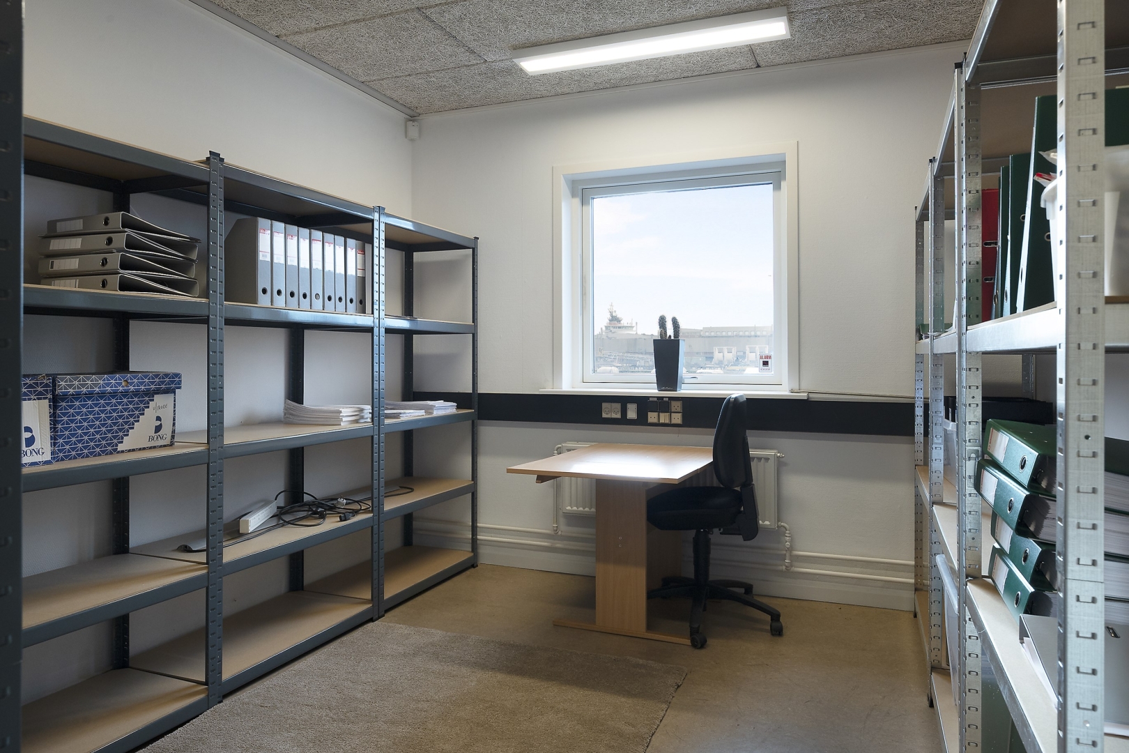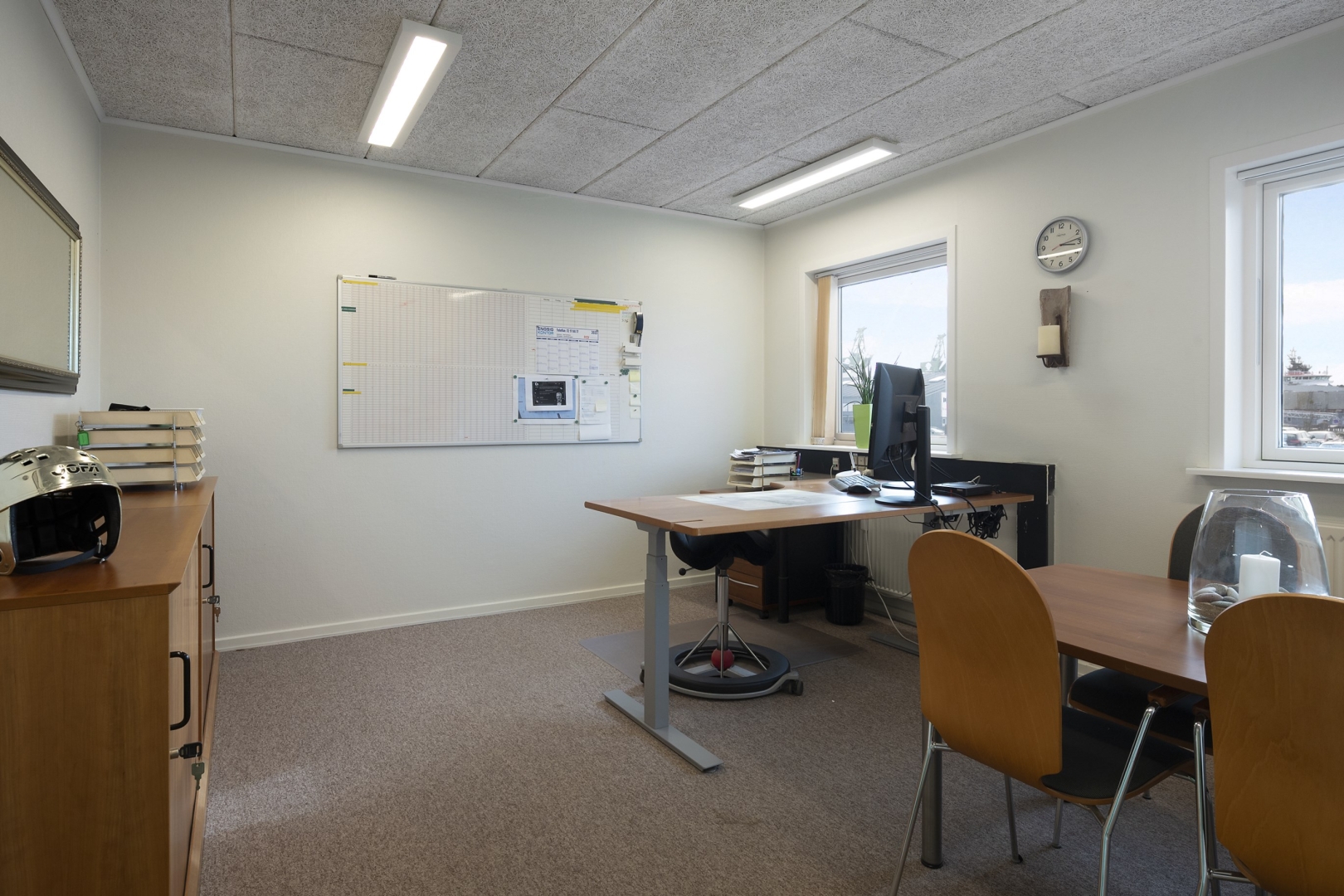 arbejdspladser, chefkontor med mødebord, kantine med plads til 20 personer, teknikrum med
