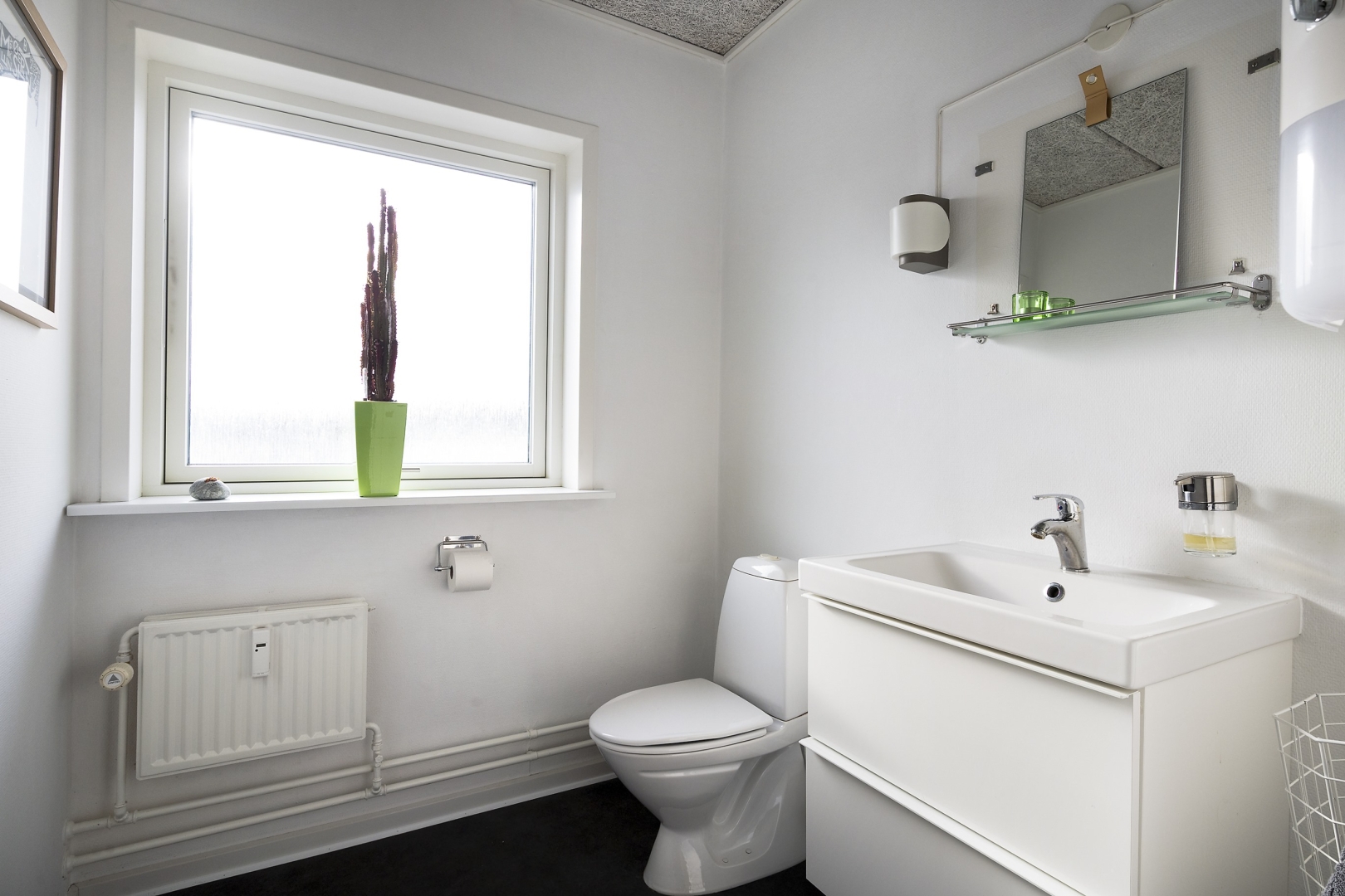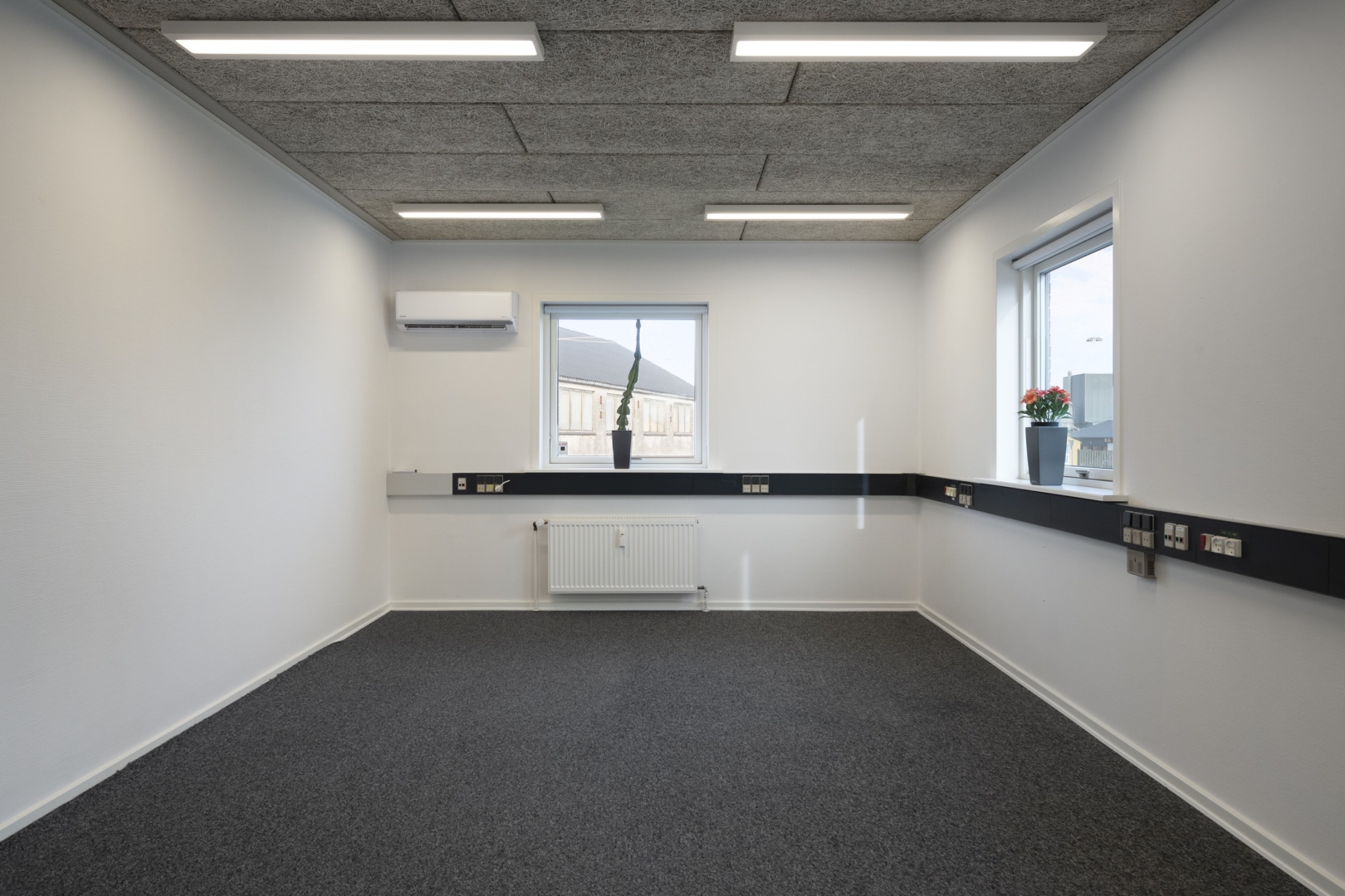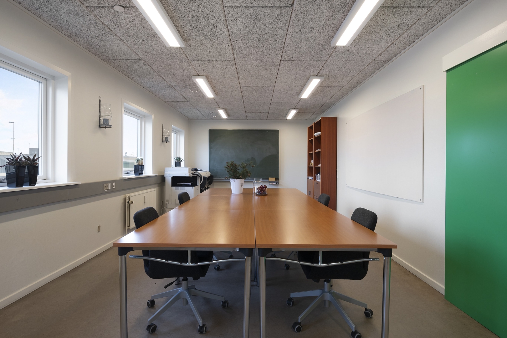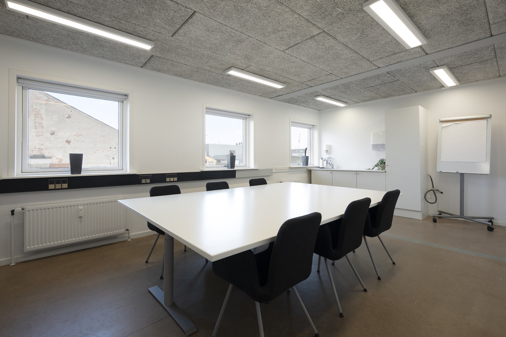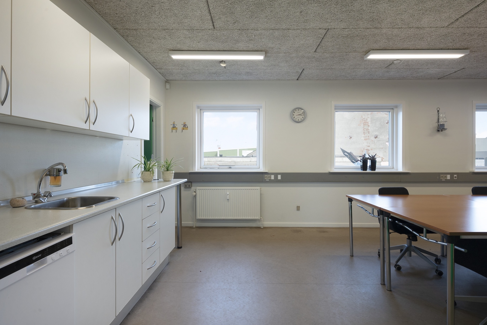 arbejdspladser, chefkontor med mødebord, kantine med plads til 20 personer, teknikrum med