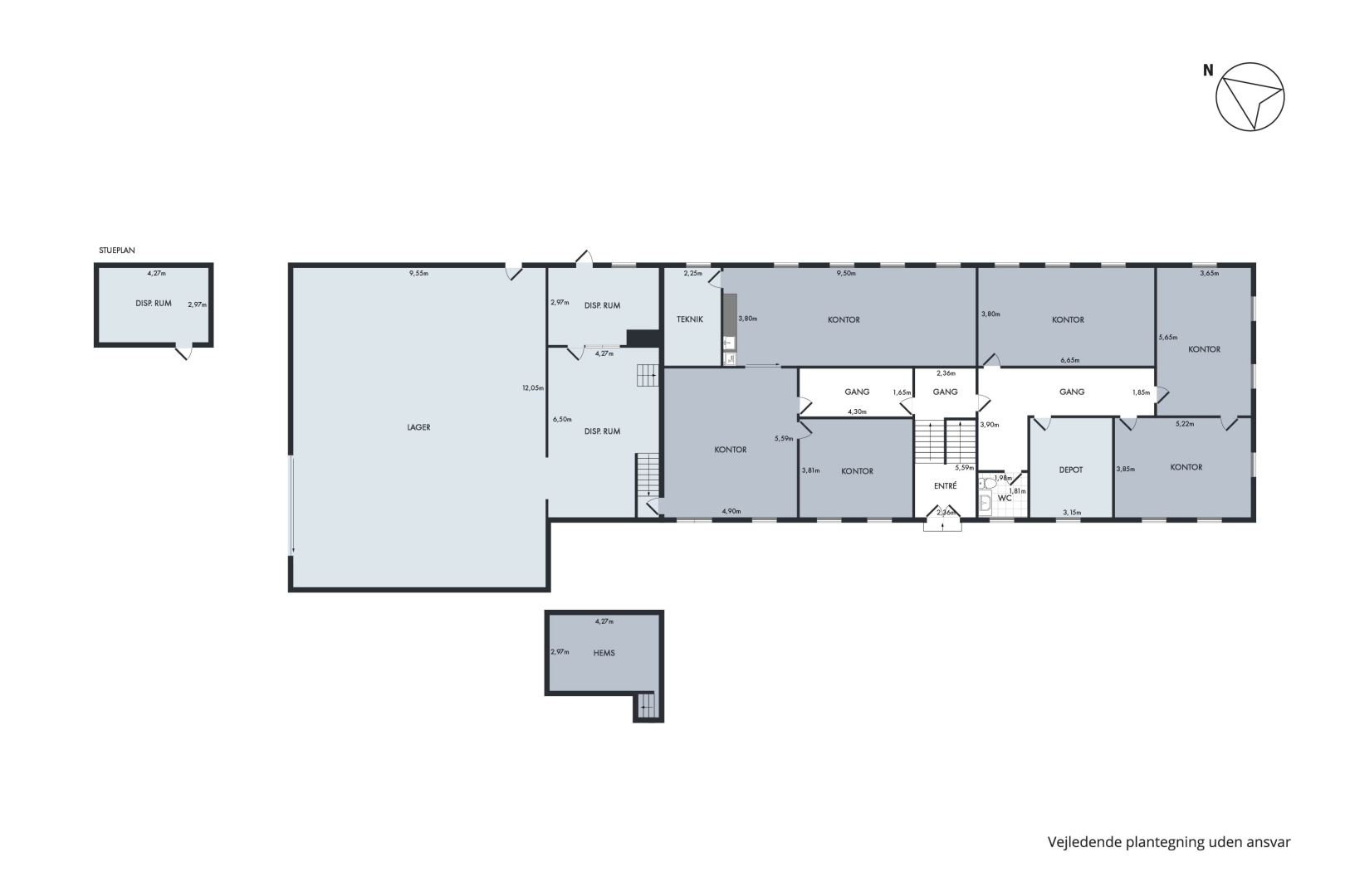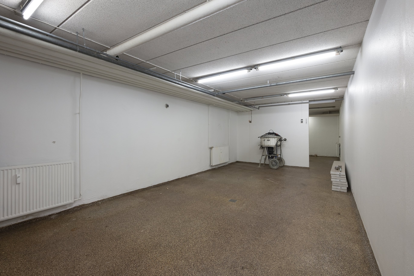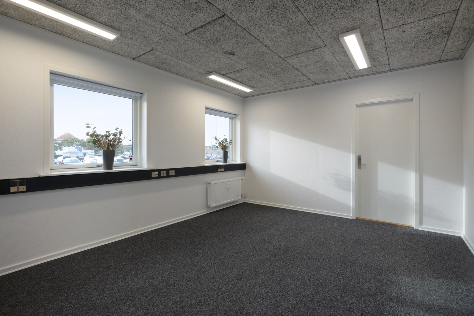 Separat lejemål med fordelergang, med garderobe og egen elmåler, toilet med håndvask, arkiv, forkontor, chefkontor med tæppebelægning.