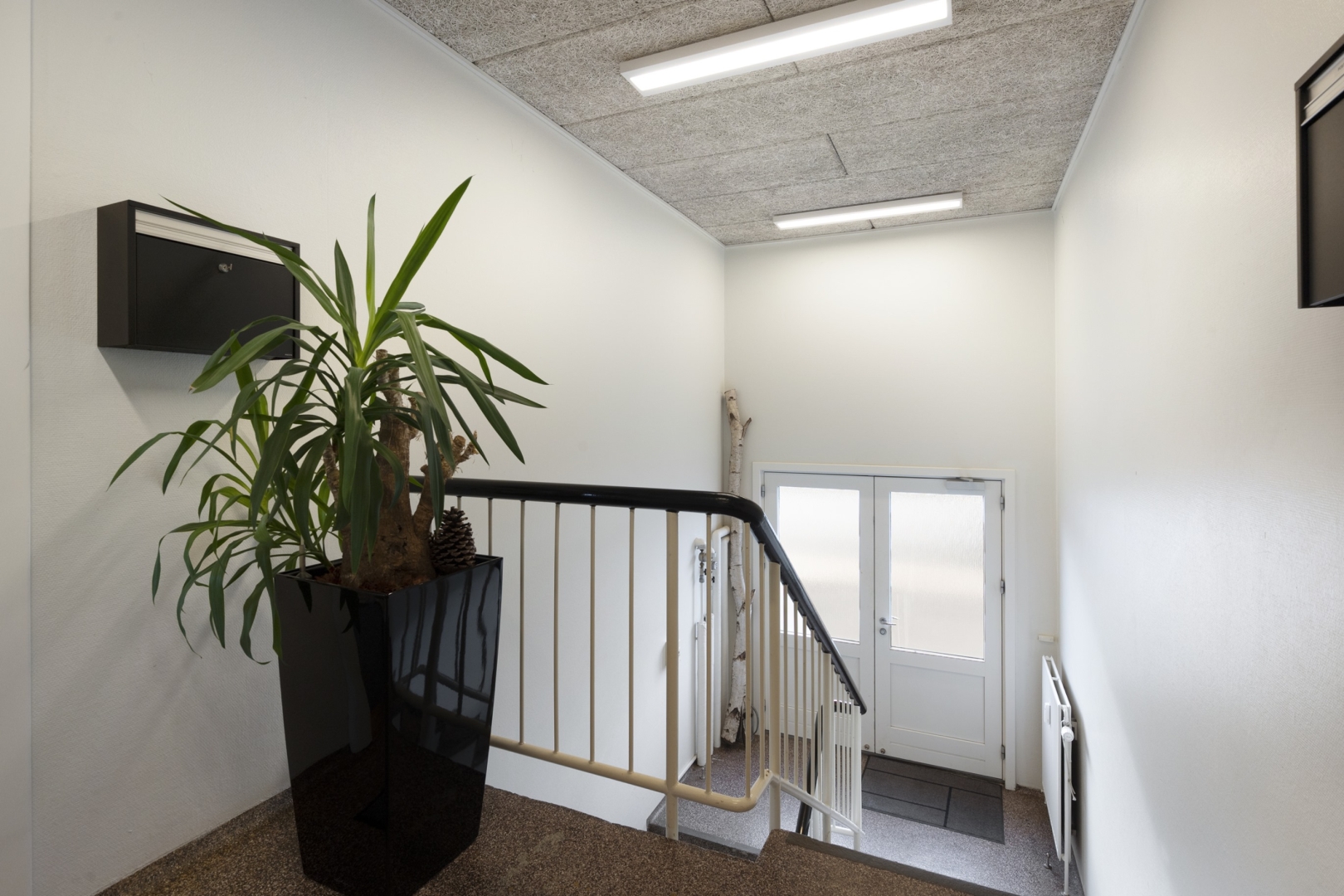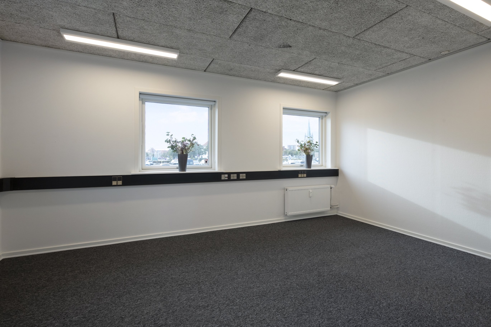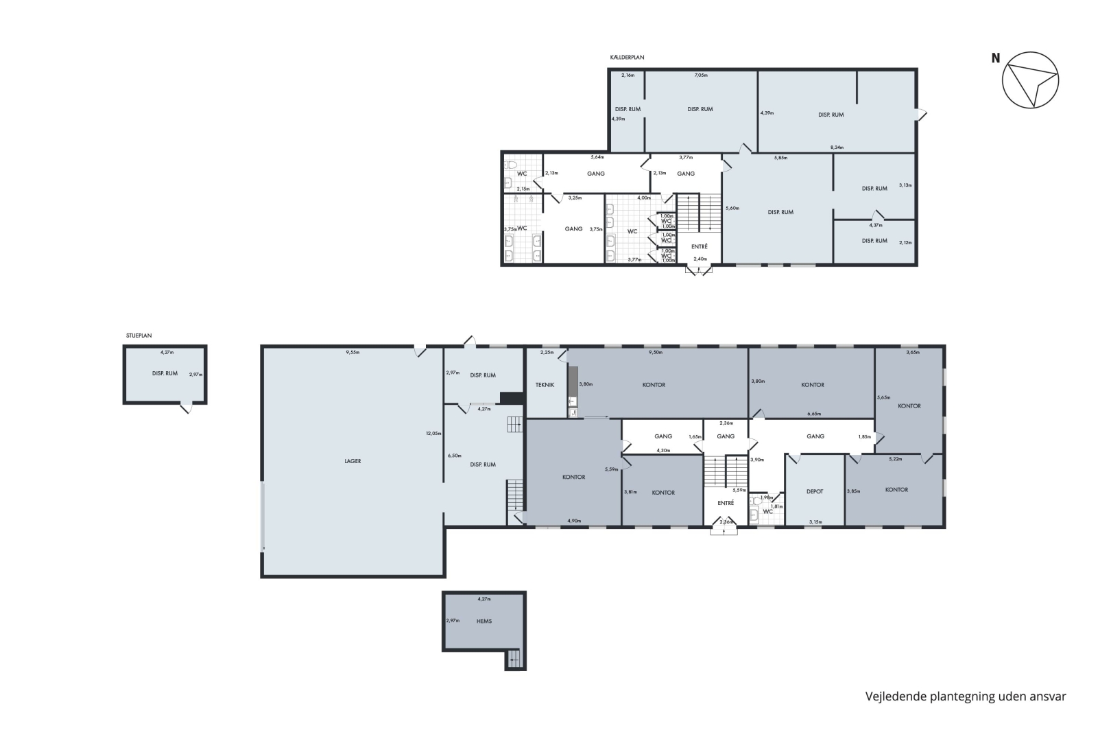 Separat lejemål med fordelergang, med garderobe og egen elmåler, toilet med håndvask, arkiv, forkontor, chefkontor med tæppebelægning.