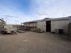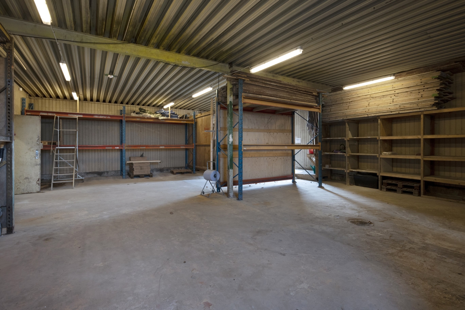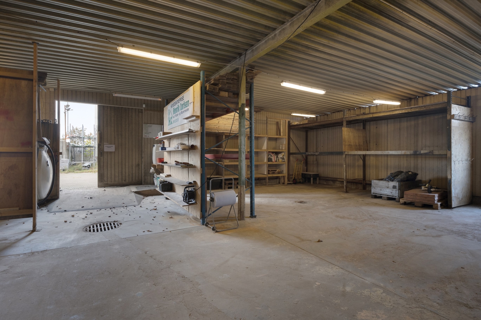 Koldlager med stålplader som tagbelægning og træbeklædning og støbt gulv med afløb.