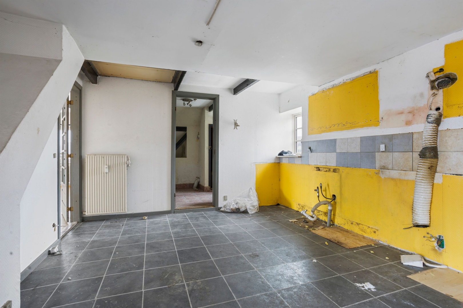 ·Lejlighed over krostuen: Denne lejlighed er tilgængelig via en udvendig trappe og har tidligere lidt under vandskader, hvorfor den trænger til renovering. Den indeholder et rum til køkken, et toilet med bruser, to værelser, opholdsstue og soveværelse.