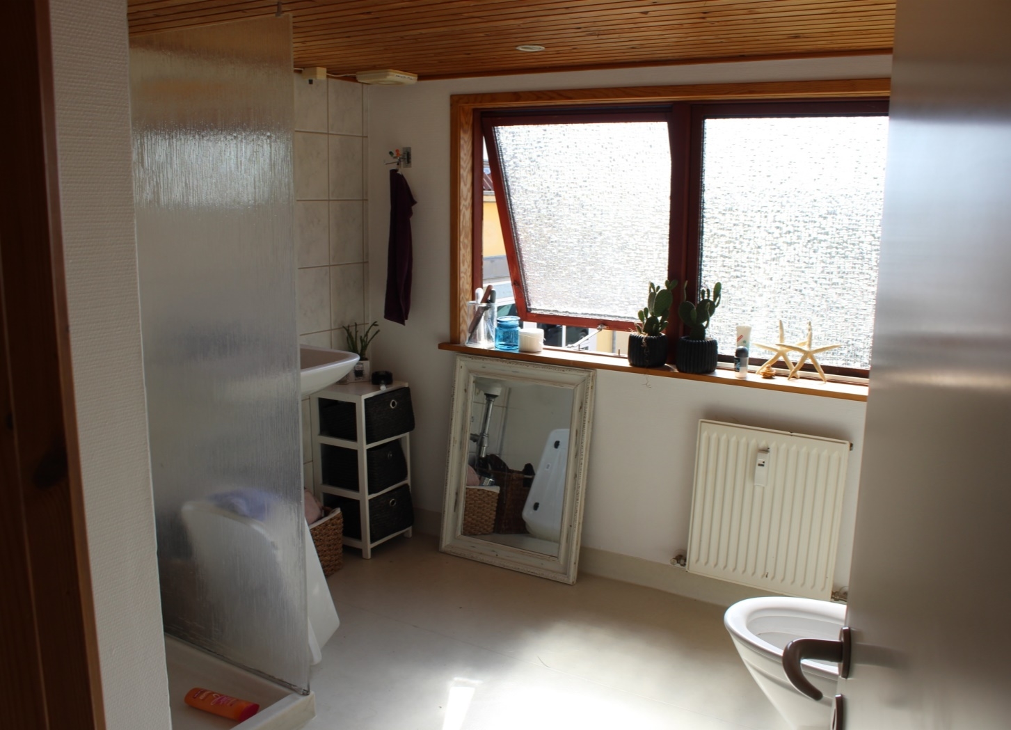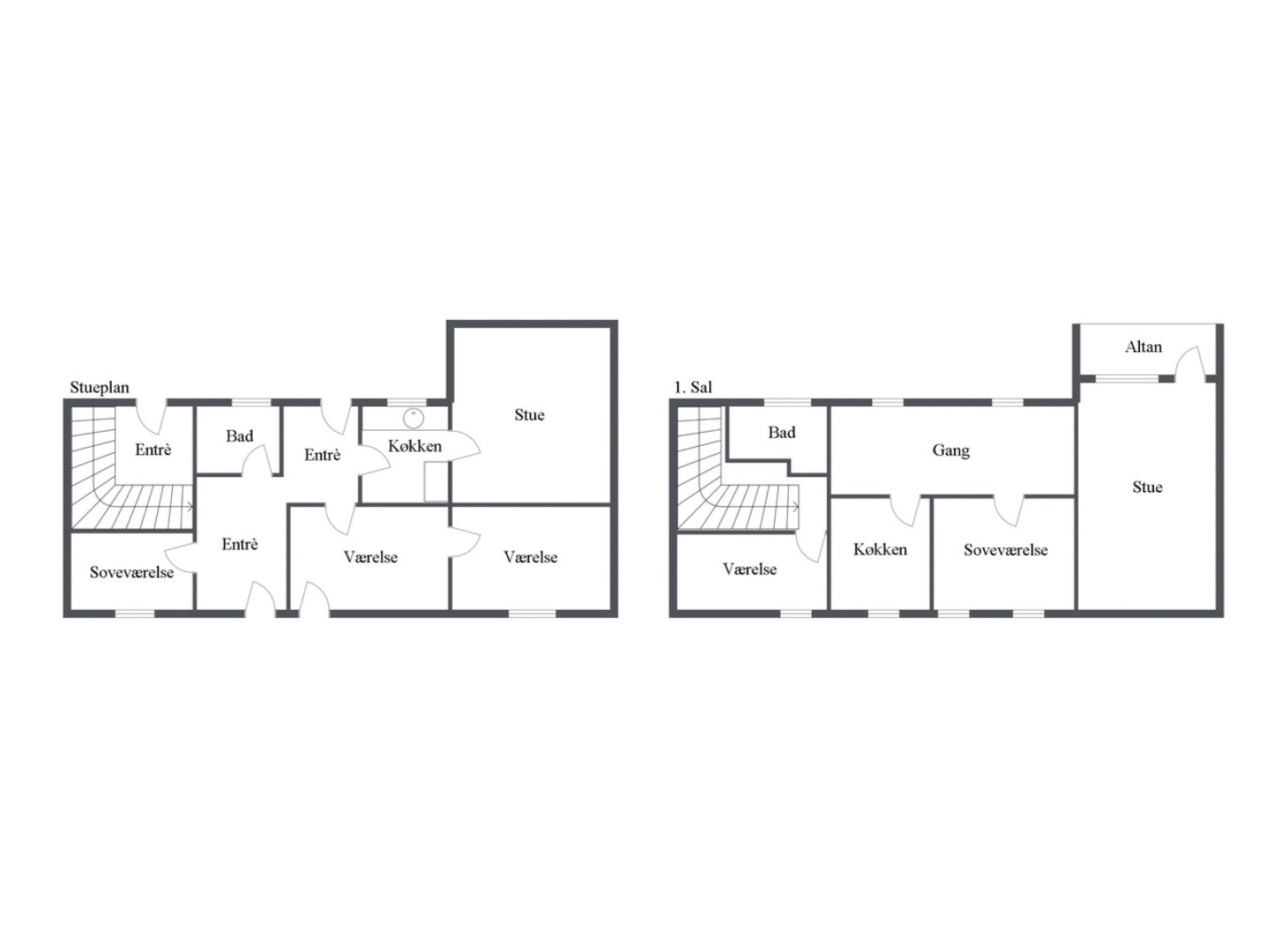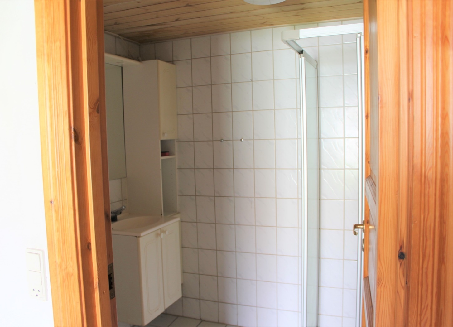 Stuelejlighed er indrettet med: Entré Køkken Stue Værelse Badeværelse med brusekabine Værelse.