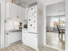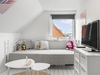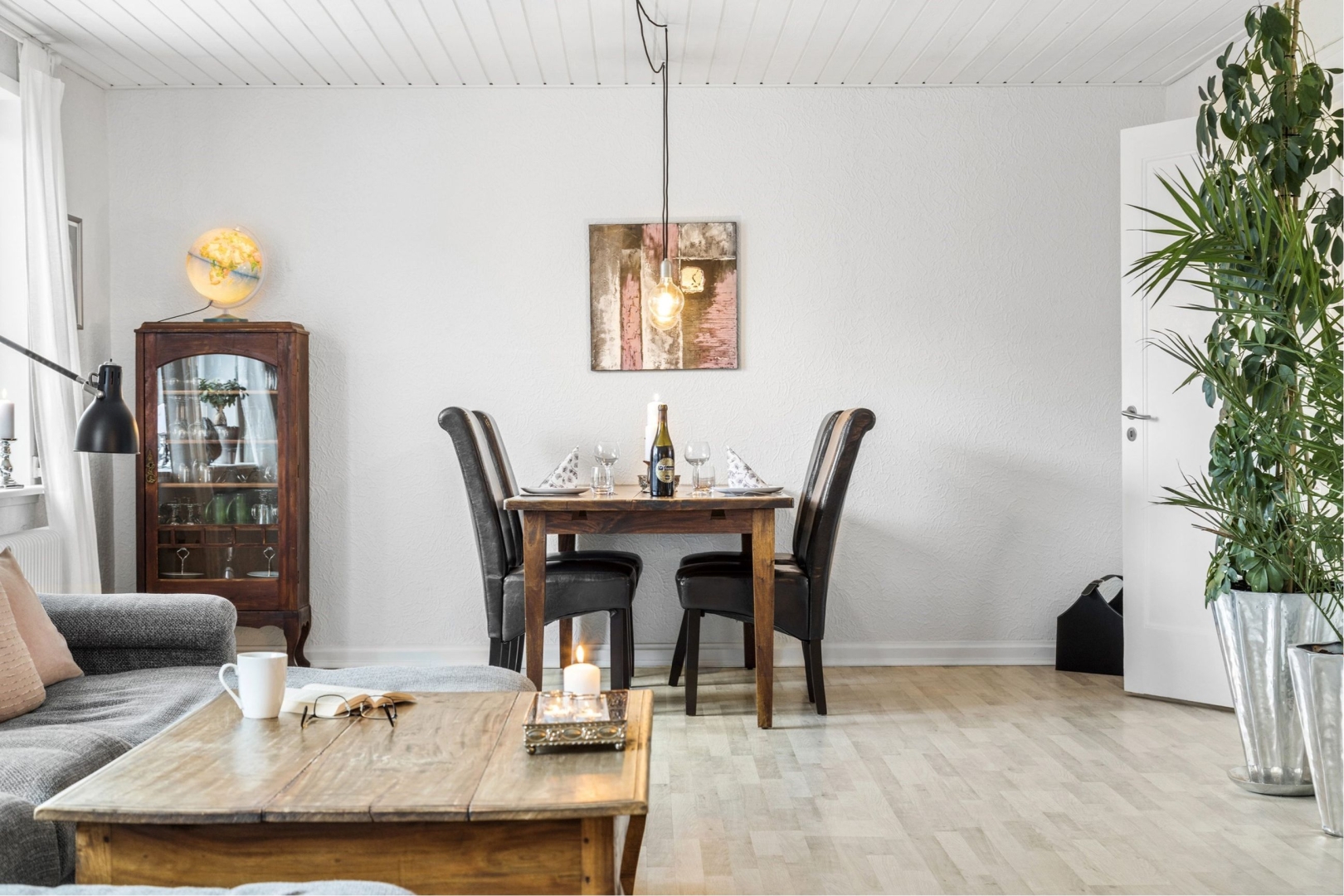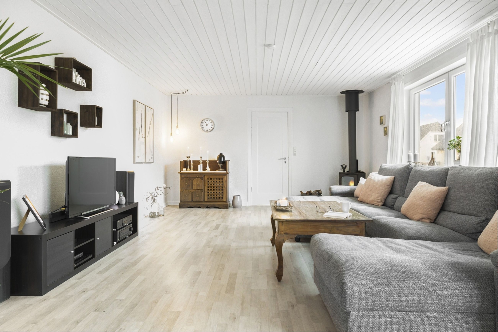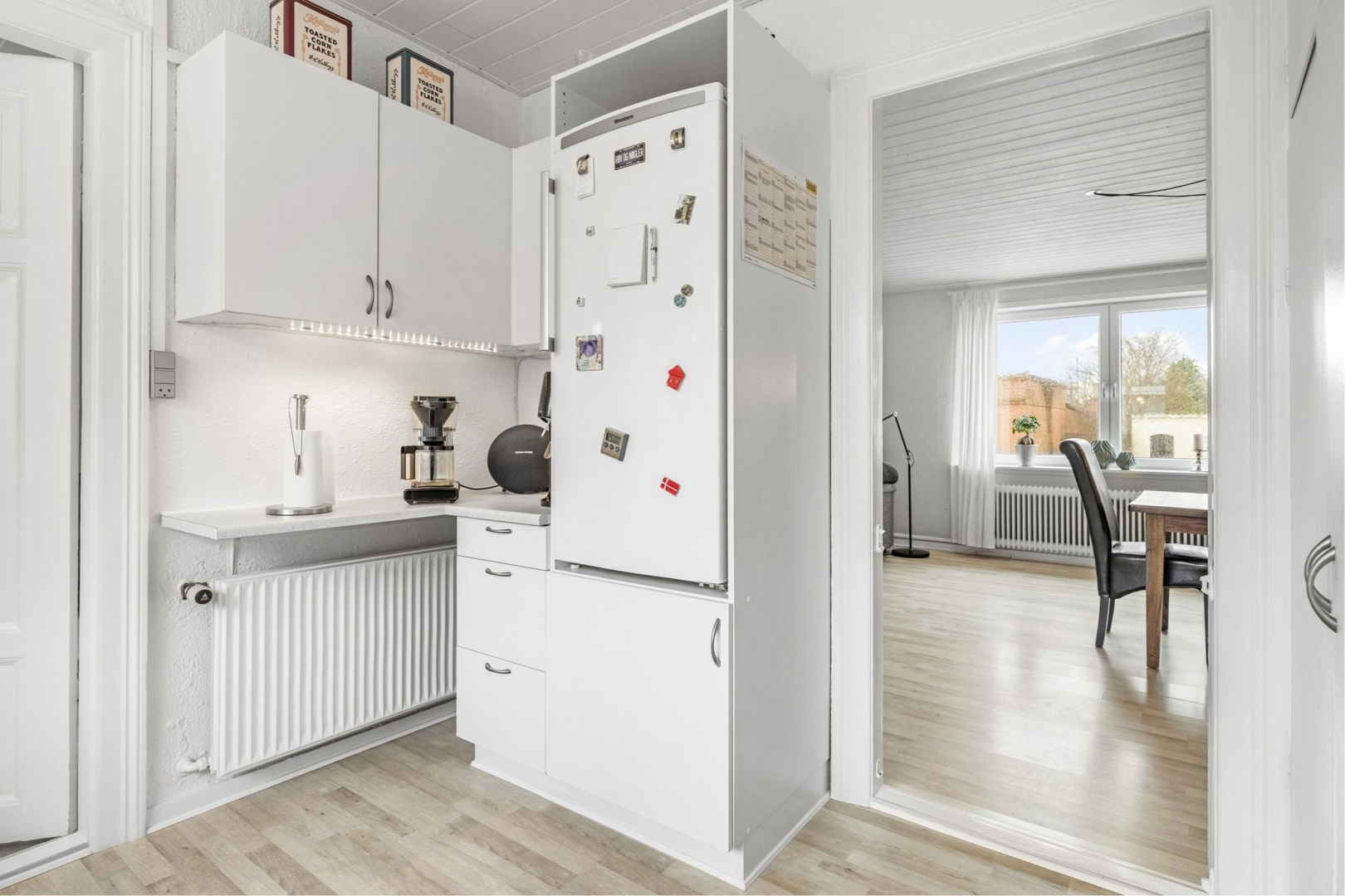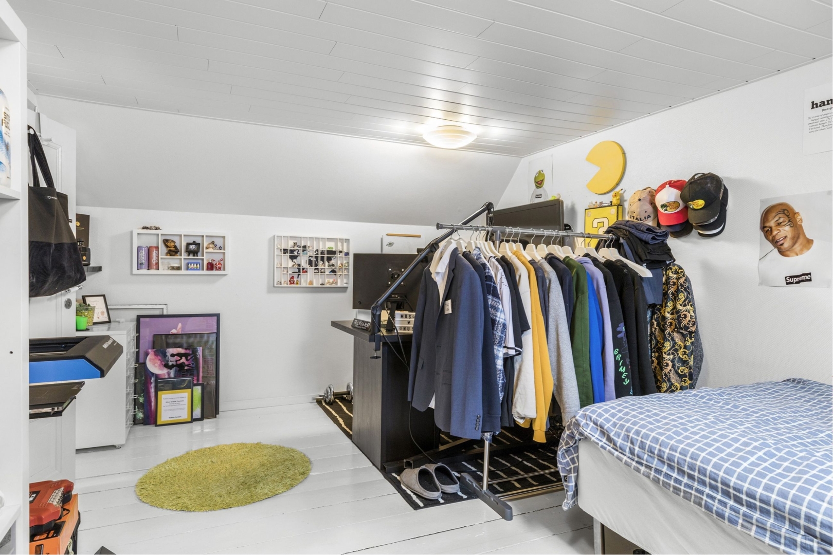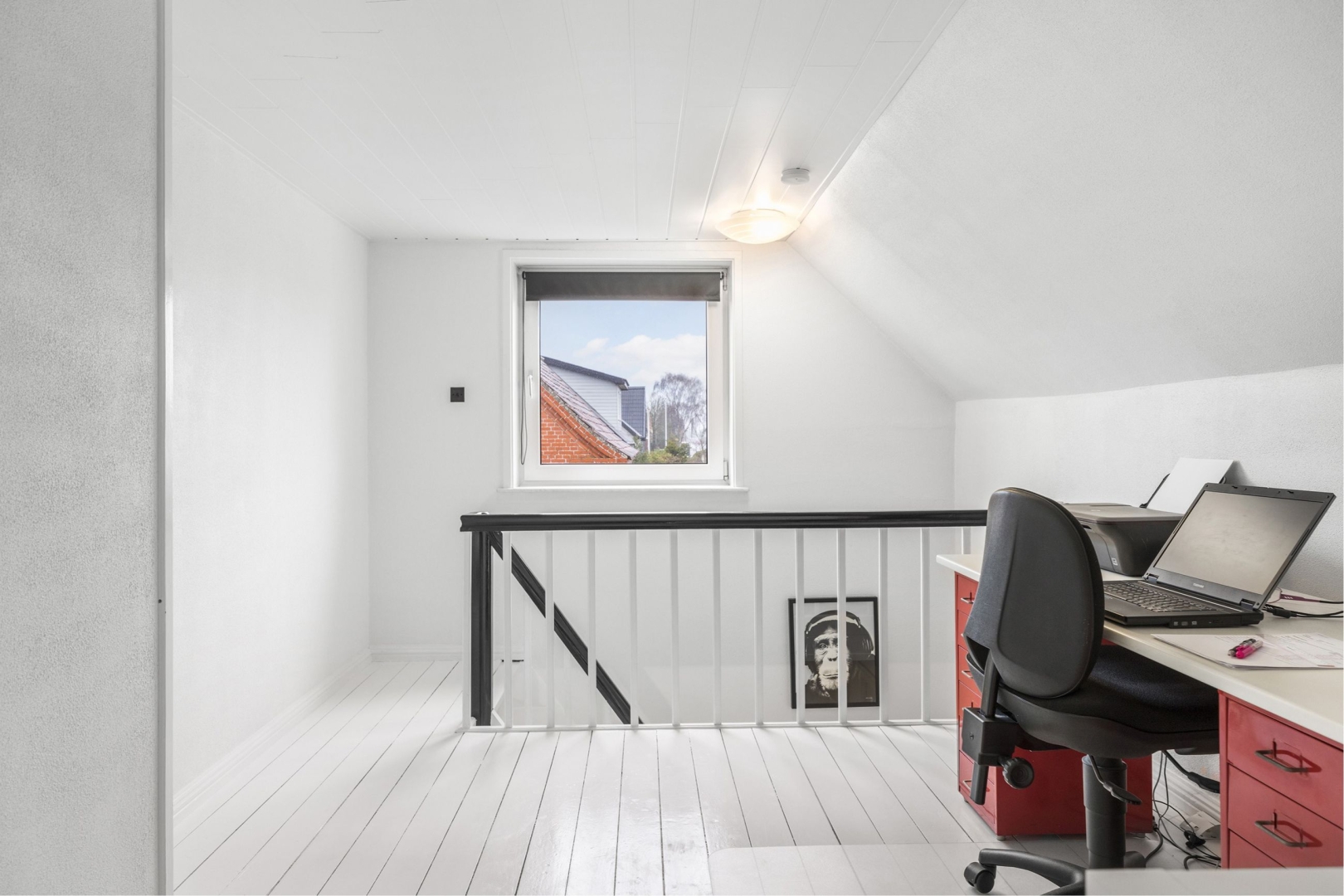 Beboelsen indeholder entre, godt indrettet badeværelse med badekar, bruseniche, skabsarrangement og direkte adgang til stort lyst soveværelse. Køkken med direkte adgang til kombineret opholds- og spisestue med brændeovn. Fra køkkenet kan endvidere fortsættes ud i baggang med lille toilet samt udgang til terrasse og have. Fra entreen går en trappe op til første-salen med et repos indrettet som kontor, værelse og gavlværelse med fint kig mod øst. Her kan boligen med få midler udvides med ca 20 m2 ud på loftet.