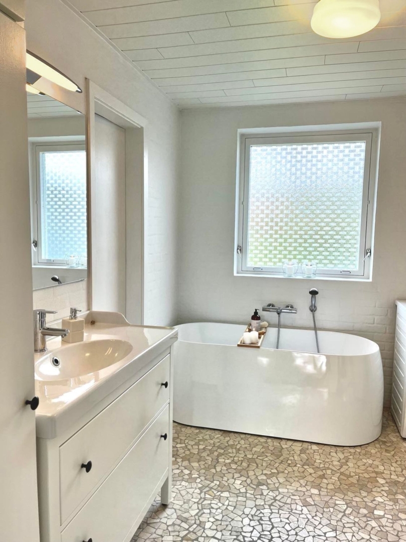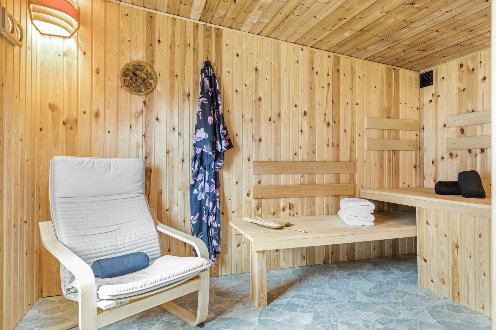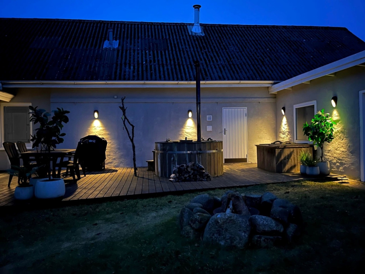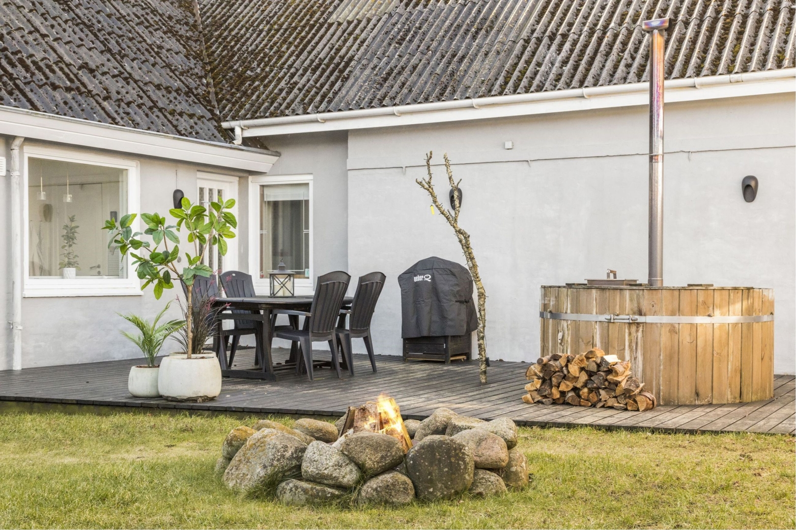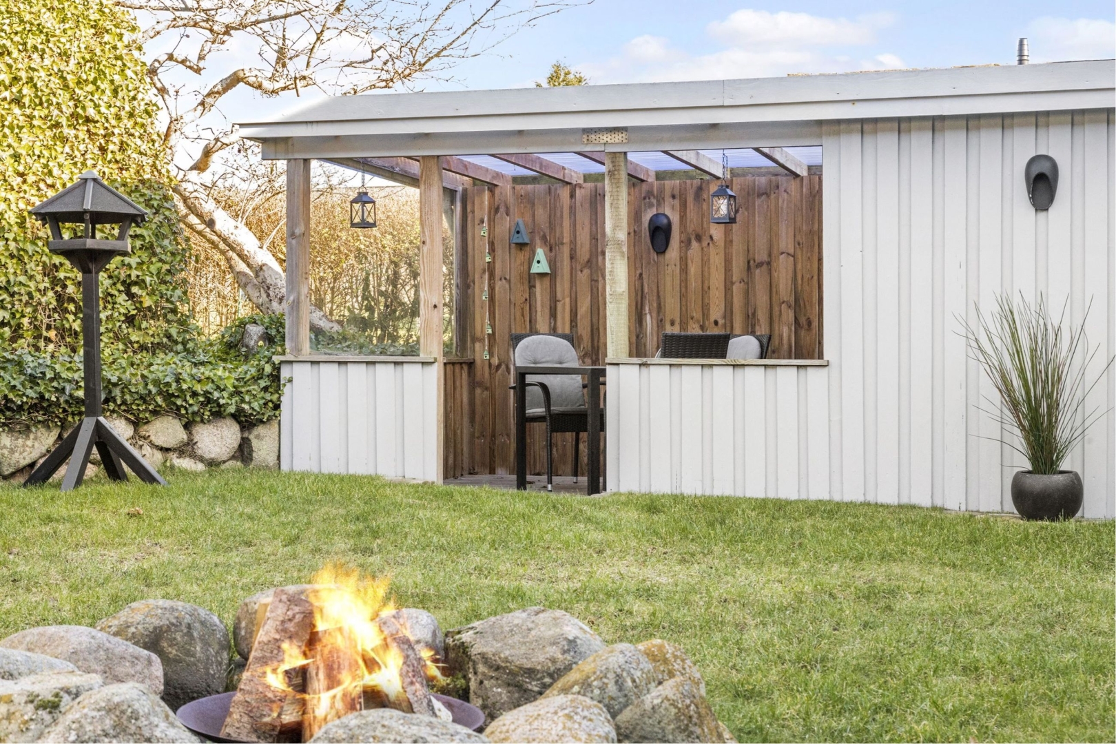 Fra lager og baggang er der direkte udgang til stor terrasse og lukket have med vildmarksbad, koldtvands bassin, sauna, brændeskur og hyggelig vestvendt overdækket terrasse i forlængelse af carport. Haven fremstår velholdt og der medfølger robotplæneklipper