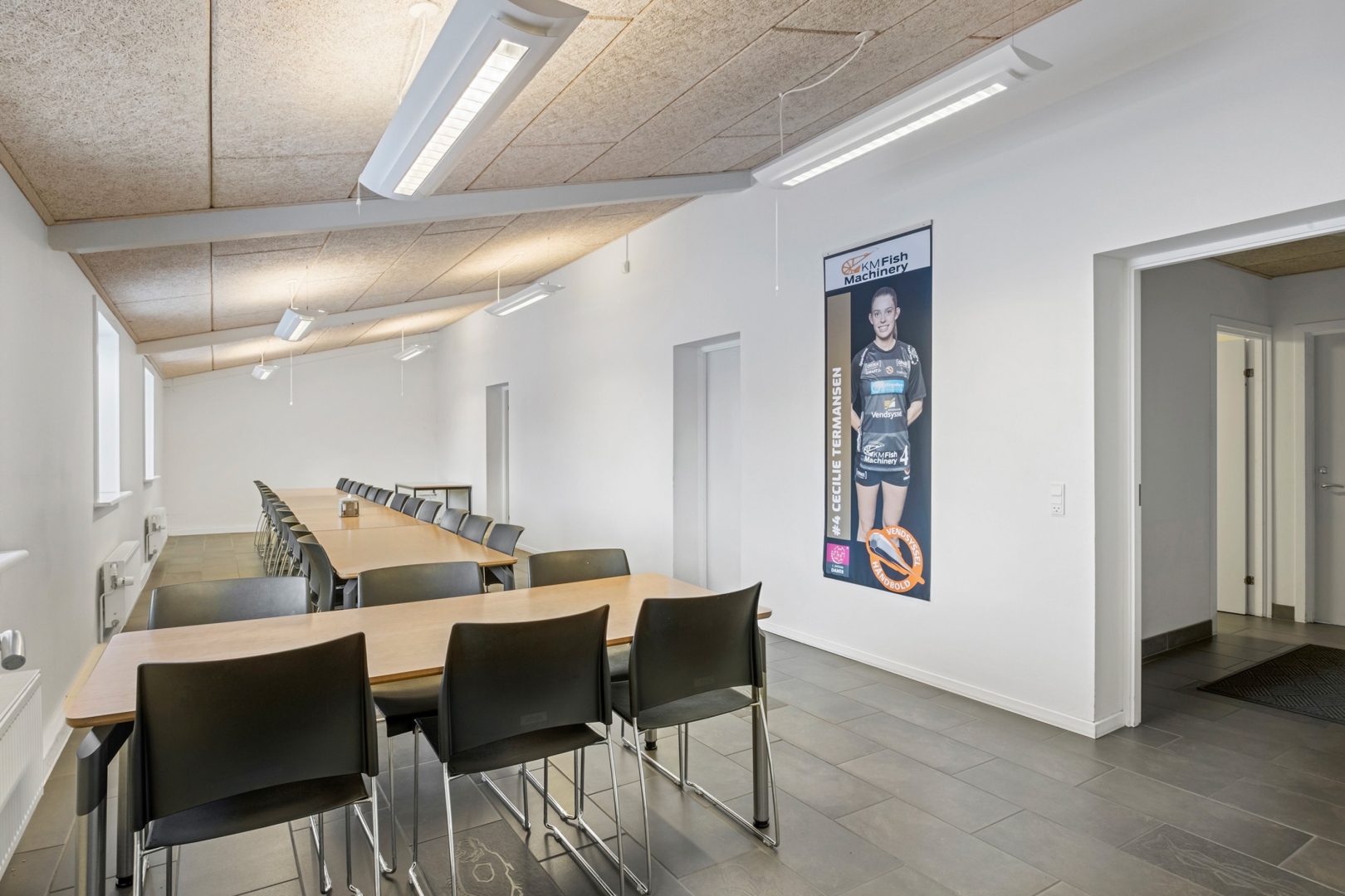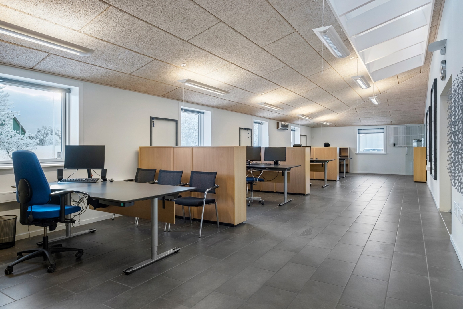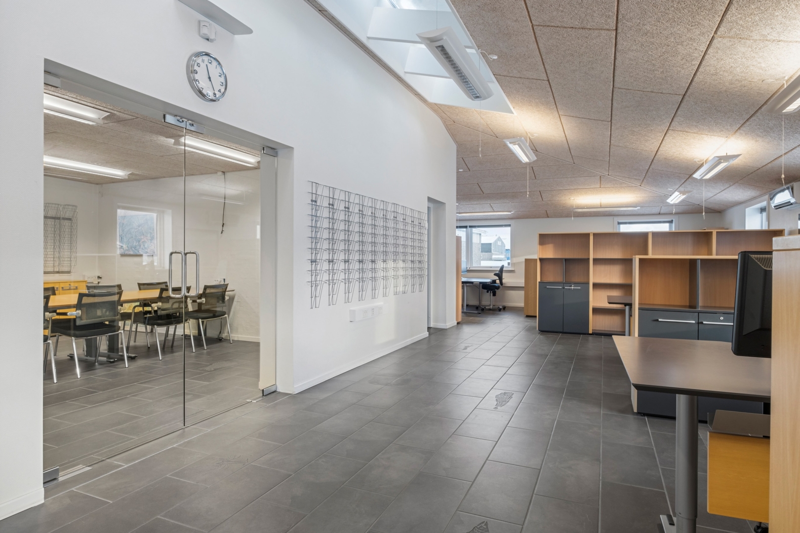 Nyere administrations afsnit indeholdende, flot hall, 2 kundetoiletter - dobbelt glasdør til såvel fin kantine og fin administration med plads til 8 - 10 arbejdspladser - arkiv og tenikrum samt mødelokale hvorfra der er direkte adgang til produktionshallerne.
