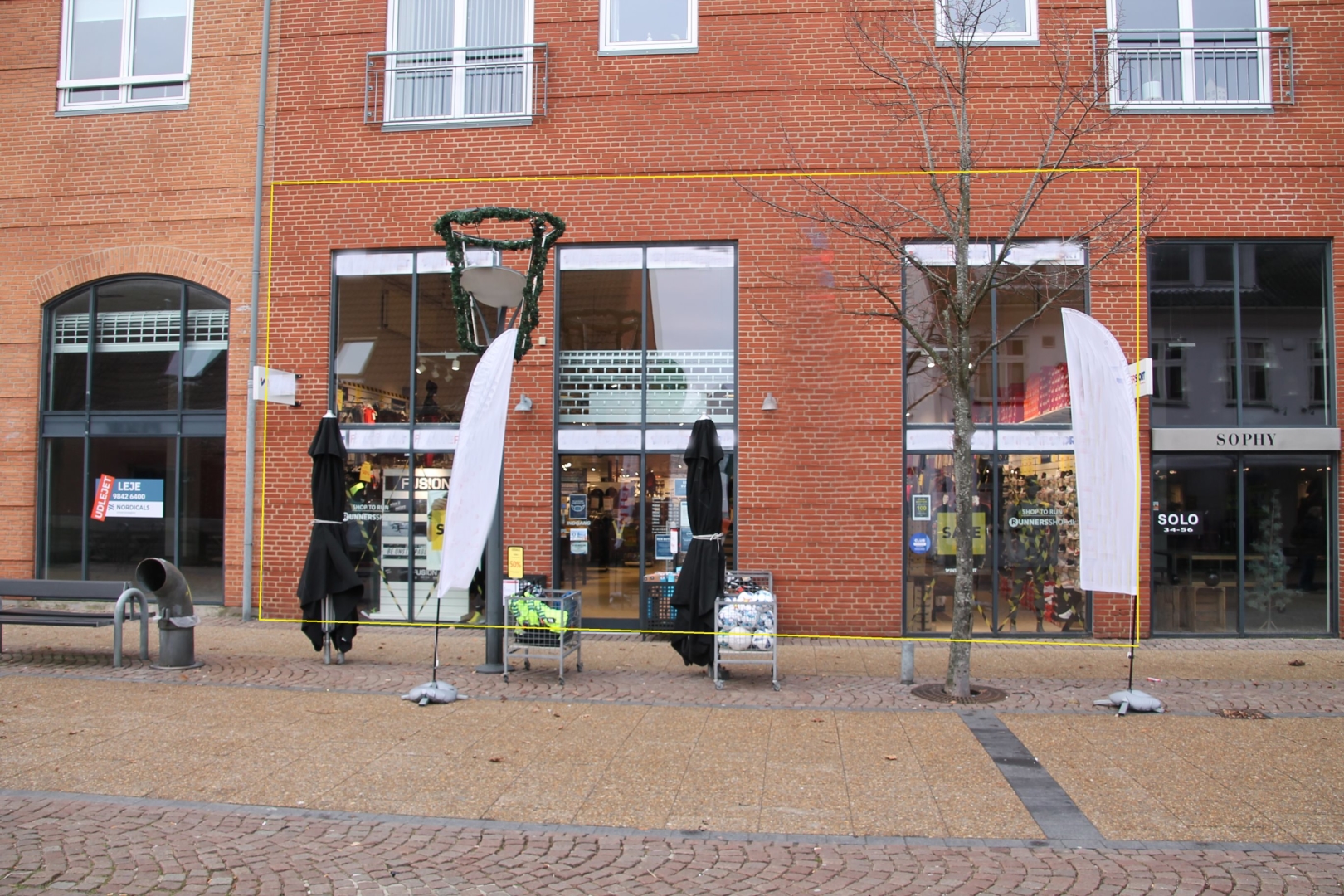 Erhvervsejerlejligheden, som er udlejet til INTERSPORT med en uopsigelighed for Lejer til den 1. august 2027, er på ialt ca. 454 m² og der er gode parkeringspladser bl.a. i gårdarealet bag bebyggelsen ligesom der er vareindlevering bag lejemålet via en forsyningsgang.