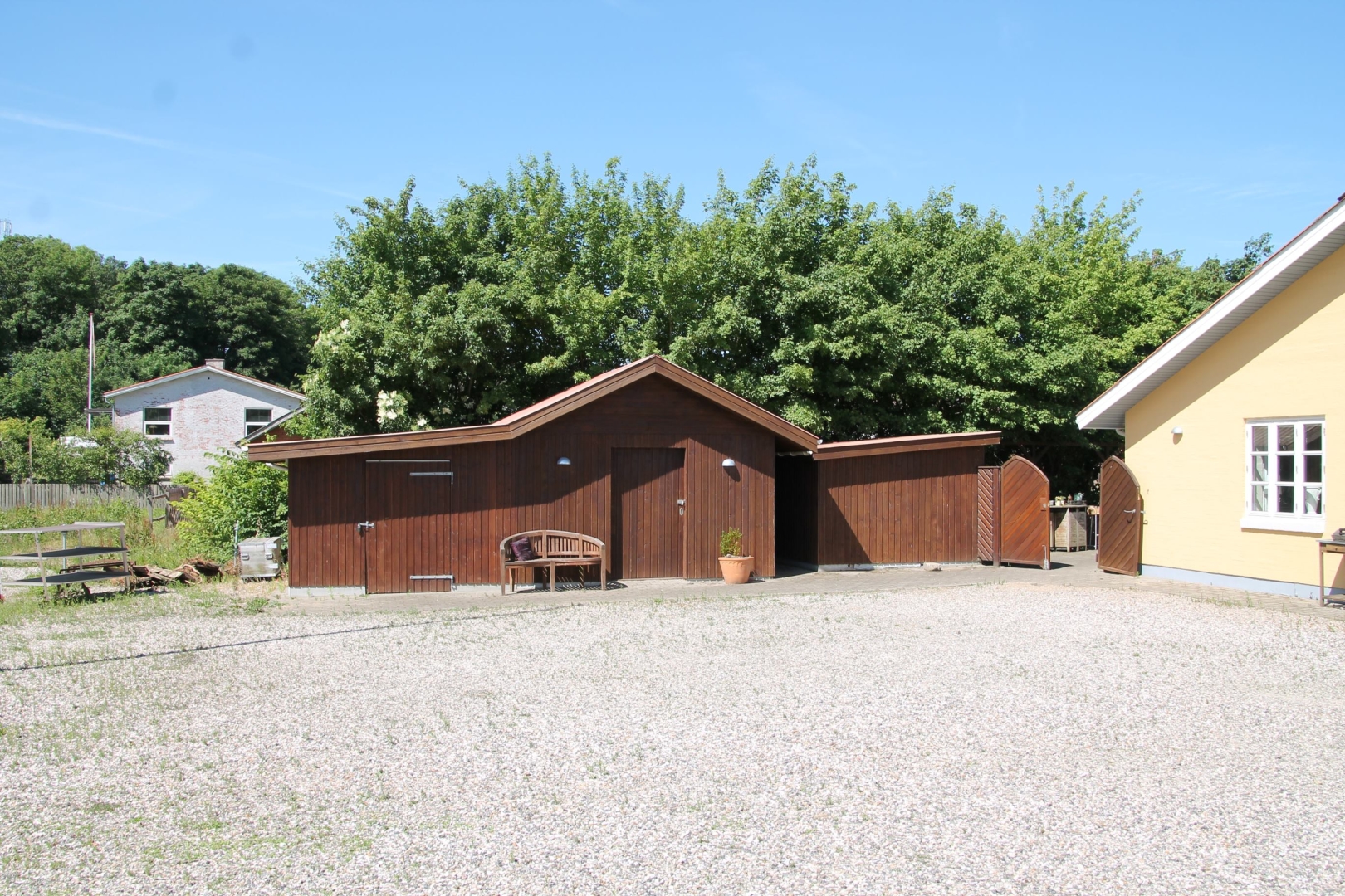 Der er udvendigt en fin lille hyggelig flisebelagt gårdhave samt 2 udhuse der anvendes til bl.a. opbevaring af havemøbler m.v..