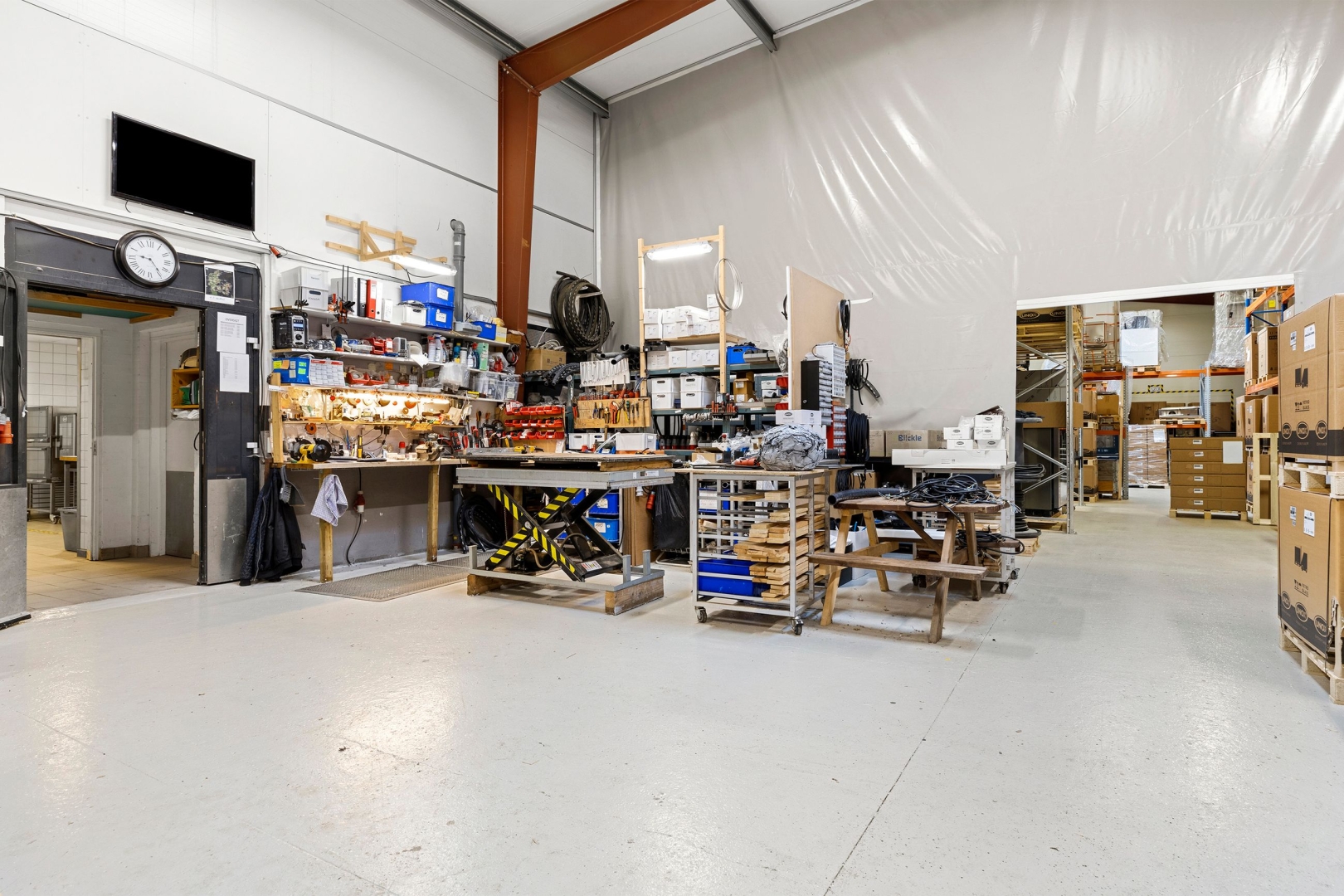 ·Værksteder og lager: 350 m² hal med eldrevet aluport, opvarmet med varmepumpe, og 200 m² værksted adskilt med preseningsvæg til grovlager.