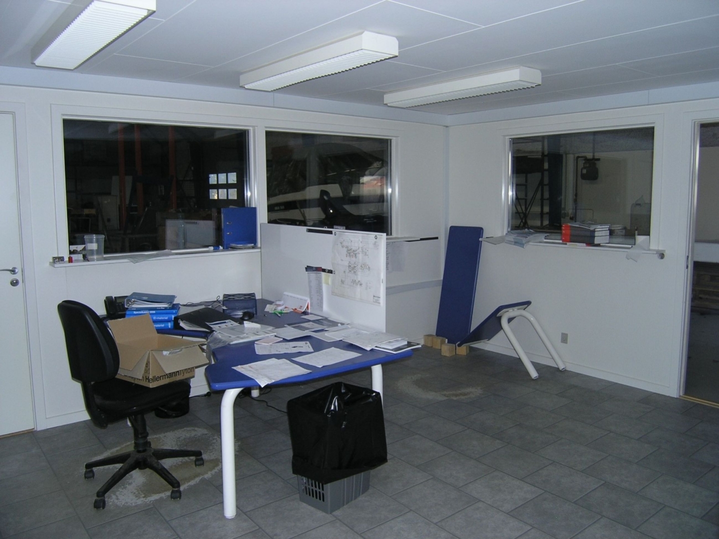 Ejendommen indeholder: Indskudt areal over administrationsafsnittet - Kontor med vinduesparti til hallen - Kantine med lille køkkenarrangement - Arkiv/teknikrum - Mellemgang til bad, toilet og omklædning - Mødelokale - Gennemgang til beboelse